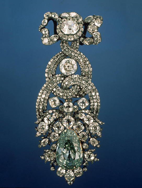 1988 年底,GIA 宝石学家获准检测东德 Green Vaults(绿穹珍宝馆)中著名的 Dresden Green(德累斯顿绿钻)。 他们格外兴奋,因为这使其得以观察天然绿钻与实验室辐射绿钻的区别(这两种钻石中的颜色通常都是由辐射产生)。 因为钻石的历史记录始于 1741 年,研究人员可以确信,它并没有经过实验室处理。 由于钻石递交检验时为镶嵌状态,因此 GIA 宝石学家们未能签发分级证书。GIA 研究人员将 Dresden Green(德累斯顿绿钻)描述为彩绿色,采用改良的梨形明亮式切磨。 它的天然绿色具有适中色调和淡灰色度。 Green Vaults(绿穹珍宝馆)记录显示,该钻石重 41 克拉。