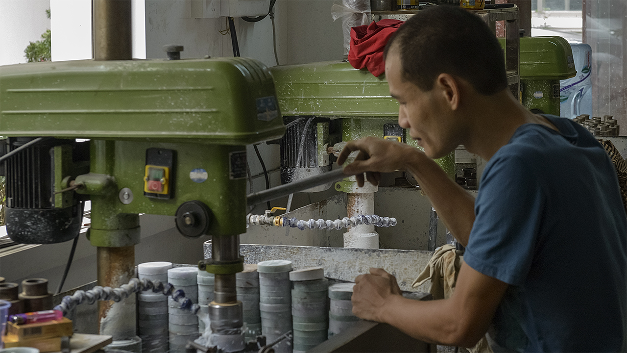 众所周知,平洲是硬玉手镯的制造和贸易中心。 逗留期间,我们参观了一家专门生产手镯的工厂。 在过去八年里,该工厂已经从十平方米发展到 2000 多平方米。 在那里,我们目睹了整个硬玉手镯生产过程。