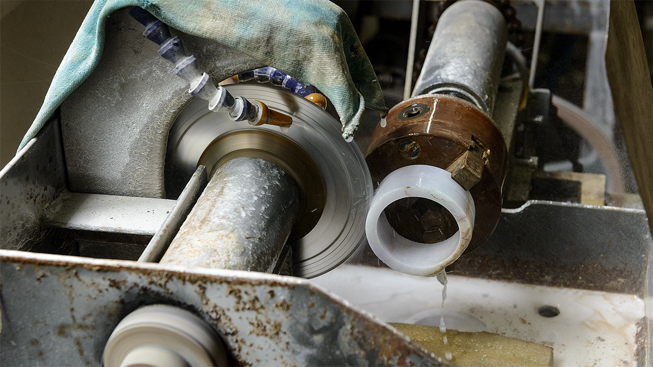首先,从硬玉砾岩中切割出翡翠厚片。 将不同尺寸的手镯轮廓画在硬玉厚片上。 用钻孔机切割出外圈的圆形轮廓。 一旦硬玉圆片成型,则使用更小的圆盘锯头钻出一个内圈。 工厂工人使用各种尺寸的锯头切割出不同手腕大小的内圈尺寸。手镯的雏形做好后,可以在此基础上加以变化,比如可以在表面进行雕刻等。 如果有裂缝,可以对手镯重新切割去除裂缝,但这样可能会降低手镯的价值。 一旦该手镯的形状和样式完成后,则进行磨光。