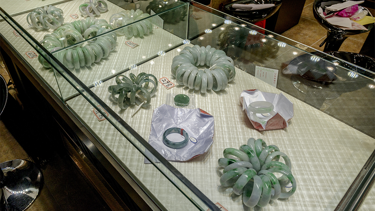 四会的一些高档商店销售品质优良的帝王绿硬玉珠宝。 – 摄影:Eric Welch,由 Hanwuyuting(汉武玉庭文化传播有限公司)友情提供。