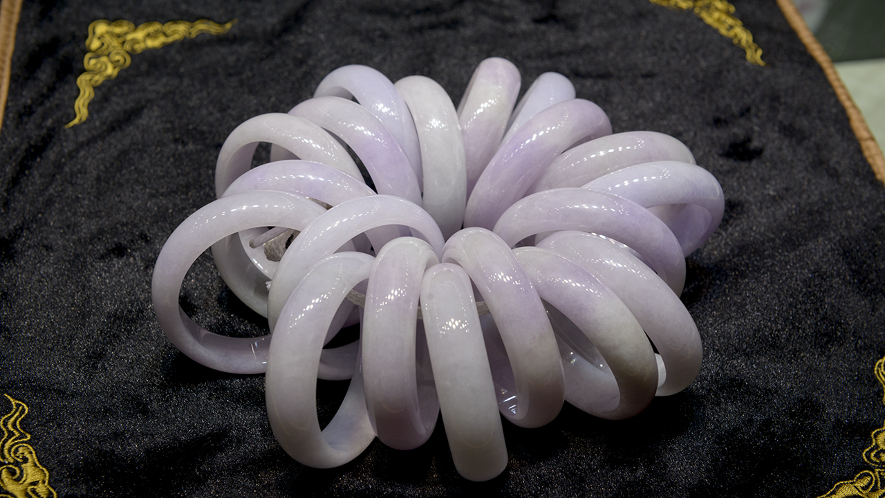 在平洲,可以看到多种风格的硬玉手镯,包括带有色域的手镯。 – 摄影:Eric Welch,由妈祖玉器有限公司友情提供