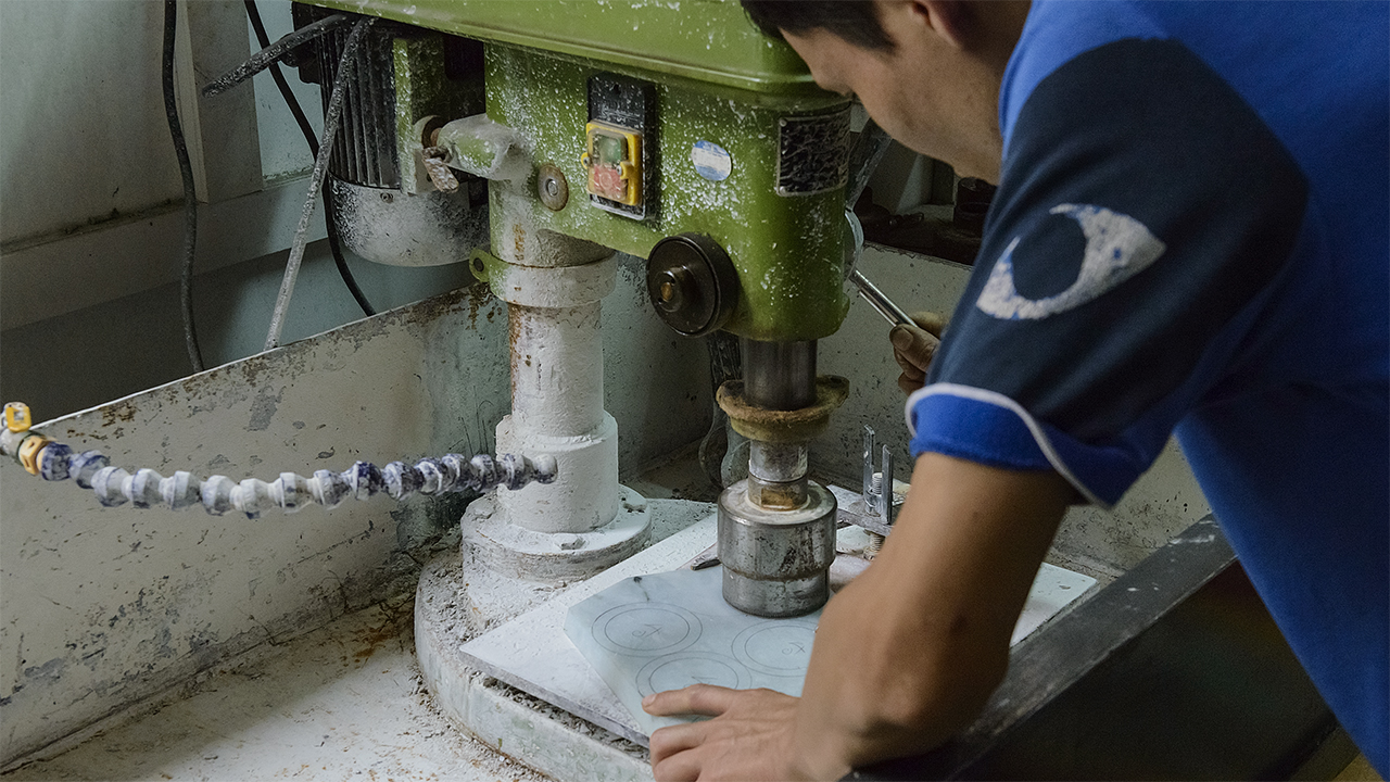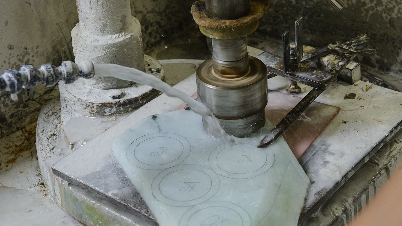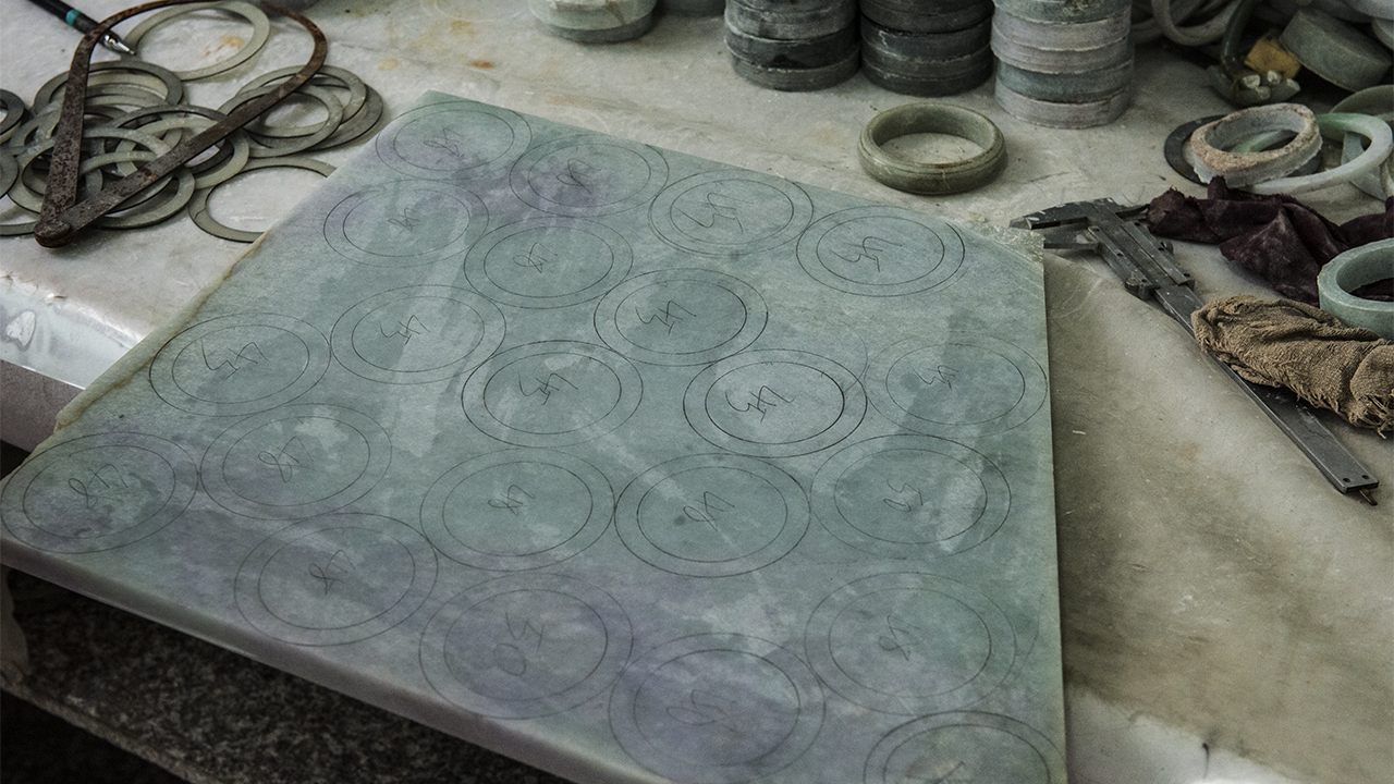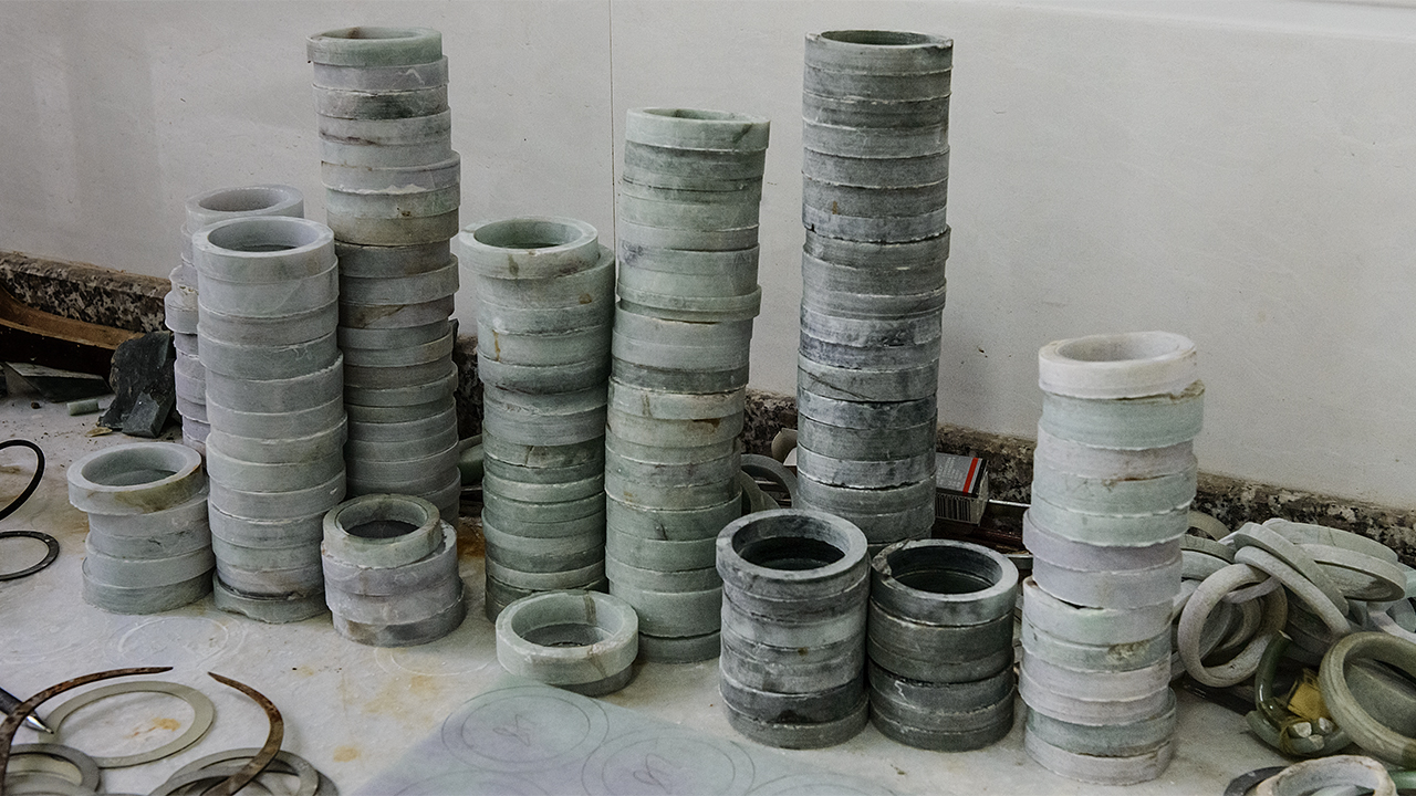 平洲是重要的硬玉手镯中心。 这些圆片是用钻床和圆盘锯头从平整的翡翠厚片上切割下来的。 – 摄影:Eric Welch