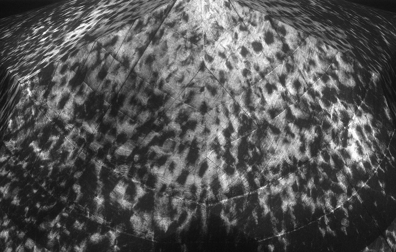 深短波紫外线激发收集的影像显示含蓝色带纹的橙红色强荧光(图3)。蓝「柱」几乎与台面垂直,近乎连续伸展至亭部及尖底。这项特色与显微镜下的晶格与正交偏光滤镜显著错位(图4)和可观察晶纹是一致的。根据荧光及阴极发光(CL)影像,培育最多经过七个步骤(图5),每层的厚度相若。这颗公主式切工钻石刻面的台面与保留最大重量的层面平行,同时也保持了最佳比例及对称度。