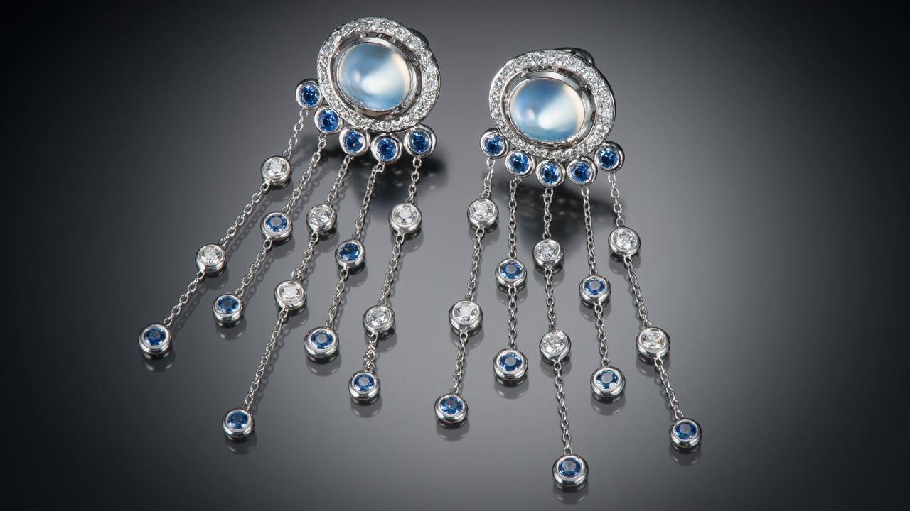 月光石是由厚度和规律性各有差异的两种不同长石构成。在月光石中,光线分散至多个方向,形成阴天特有的蓝白色光,称为青白光彩。