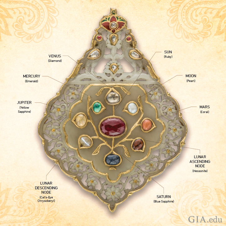 为生活感到担忧?正在忍受慢性病的折磨?对钱财或权力感到绝望?九宝(“九个宝石”)是印度教力量最强大的护身符之一,也是穆斯林统一使用的珠宝之一。九个宝石代表印度占星术中的天体 —— 太阳(红宝石)、月亮(珍珠)、水星(祖母绿)、火星(珊瑚)、木星(黄色蓝宝石或拓帕石)、金星(钻石)、土星(蓝色蓝宝石)以及月亮升起(锆石或金黄榴石)和落下(猫眼)的节点。