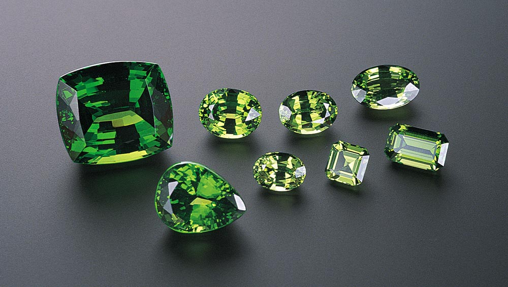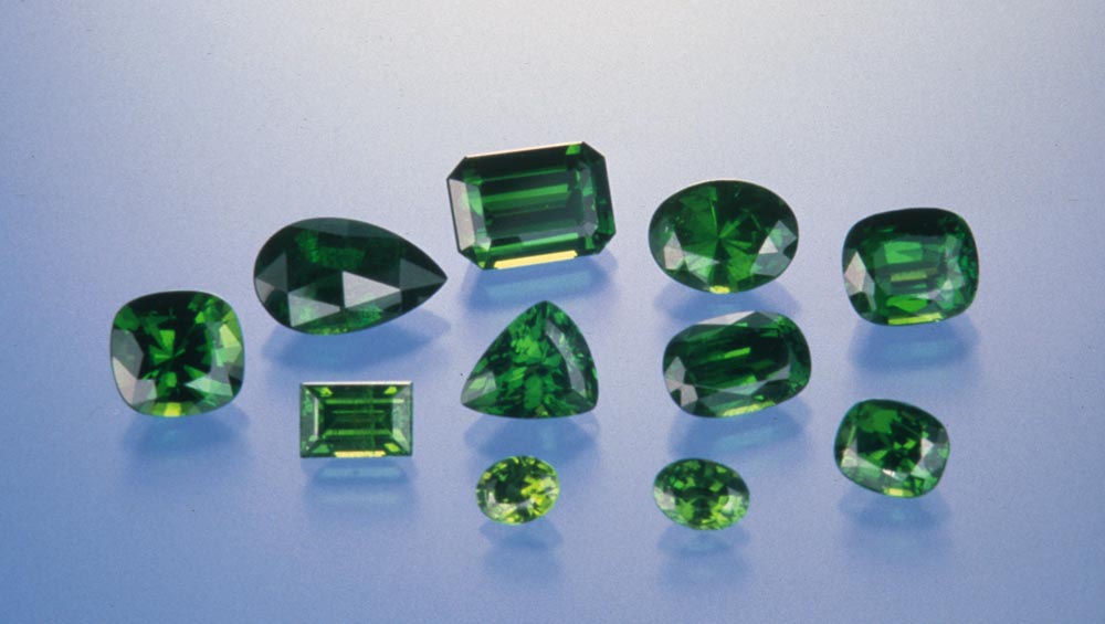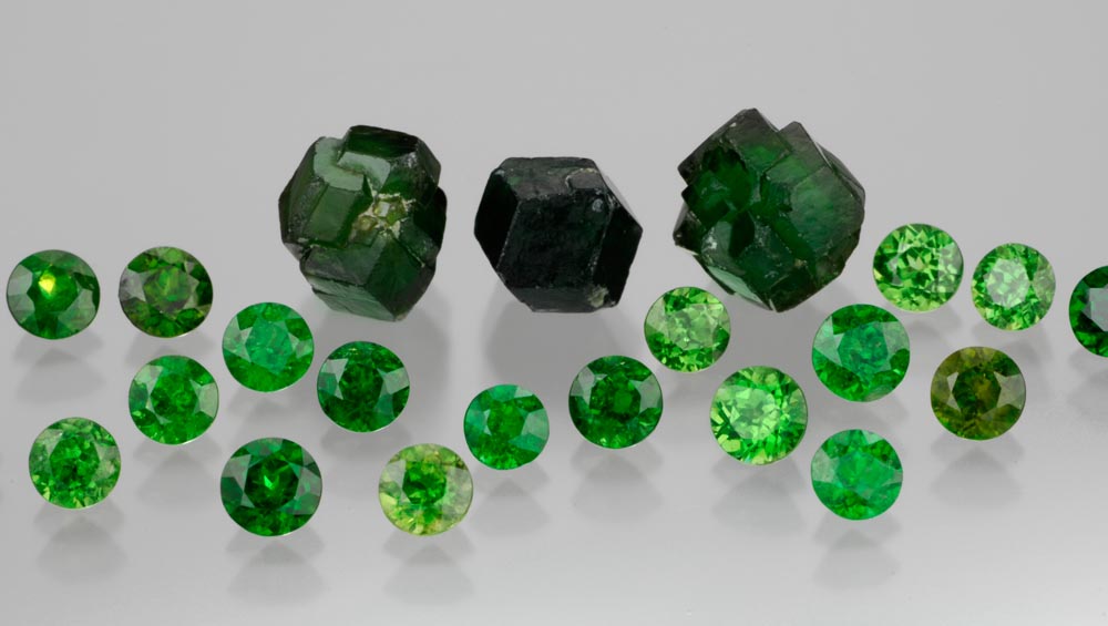 ツァボライトとデマントイドは同じ緑色であっても、これらはガーネットグループの別の鉱物です。 ツァボライトはグリーングロッシュラーで、デマントイドは緑色のアンドラダイトです。 アンドラダイトはグロシュラーよりも硬度は低いものの、より高い屈折率と分散度を有しています。