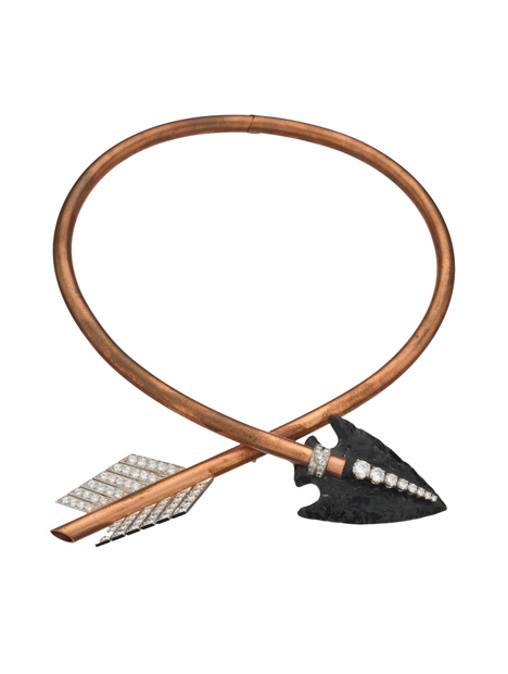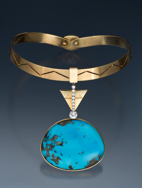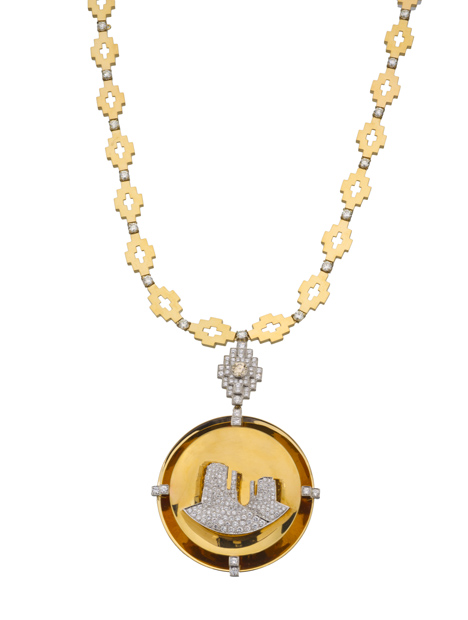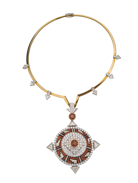 合計2.61カラットのブラウン ダイヤモンド、合計17.83カラットのダイヤモンド、18Kイエロー ゴールド、プラチナ、アメリカ先住民の陶器を使用して制作されたこのペンダント(幅8cm)は「アコマ ジュエル(アコマ族の宝石)」として知られている。