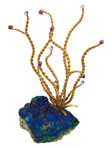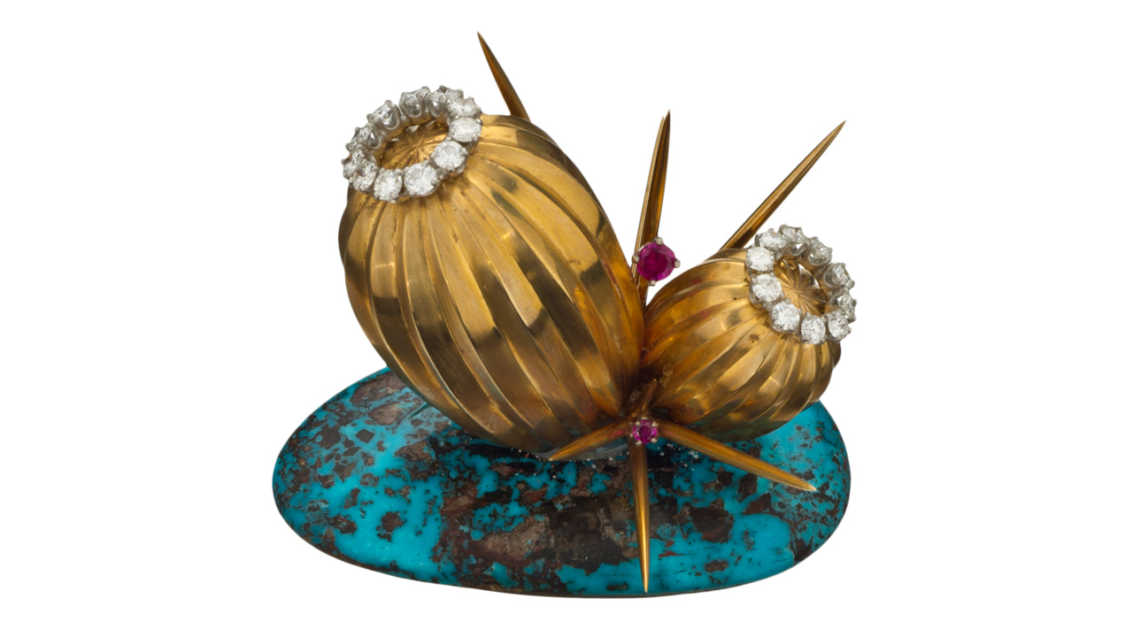 このユニークなコレクションは、Pierre Touraineがデザインした、アメリカ南西部の雰囲気が漂うジュエリーを特徴とします。1930年代、Pierre Touraineはヨーロッパの貴族や著名人のためにユニークな作品を制作し、これらのジュエリーが数々の賞に輝いたことで有名になりました。1938年にアメリカに移住した後、ニューヨークのハリー ウィンストン社で働き、その後ロサンゼルスで自分のビジネスを創設しました。それ以降、Touraineはアメリカ先住民の職人にヨーロッパのジュエリー製造技術を教えてきました。アメリカ南西部の風景と文化に対する彼の情熱が、この展示で紹介された作品で見られるように、最も素晴らしい作品のデザインと素材のインスピレーションとなりました。