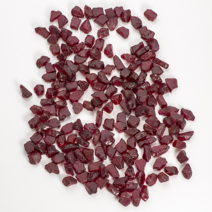 素材はさらに、サイズ、形状、クラリティで分けられます。 プレミアムルビーは、最大の22ミリメートル以上から、下は2ミリメートルまでの7種類のサイズ分類に細分されます。Muglotoは、鉱石1トン当たり2~3カラットを産出します。 一次鉱床のManinge Niceの素材は、「サファイア」(インクルージョンが多く板状で亀裂の入ったピンク系の素材)から、良質でファセット向けの品質のものまで変化に富みます。 こうした石がトン当たり162カラットほどと沢山あります。 事実この鉱床は、この場所に訪問した人が文字通り、あらゆる品質のコランダムがあちこちに散らばる地面の上を歩けるほどに豊かです。