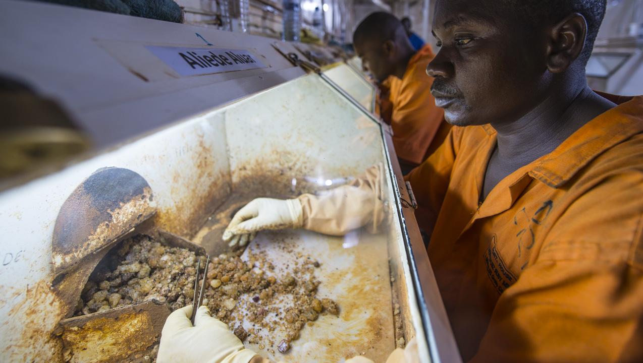 正確にグレーディングするための鍵は、粗選鉱(およびソーティング)から始まる、とソーティングマネジャーのVijay Ameriyaは説明しました。 選別場は、二重有刺鉄線フェンスに囲まれた、鉱山本部構内の中央に建っている白いレンガ造りの建物です。 選別場の内部では、労働者は徹底的に原石をきれいに洗浄します。 彼は説明を続けます。「回転ドラムでゆっくりと回し、母岩のほとんどを取り除きます。」それから必要に応じて、結晶から母岩をこすったり切り出したりして取り除いていきます。 カゲムの選別室では、労働者は外科手術のような注意を払い、小型のハロゲンライトで照らしながら素材の価値にならない部分を除去します。 「こうすることで、正確なグレーディング、ソーティング、重量測定、パーセル作成を通して高いレベルの価値付加が可能になります」と彼は言います。