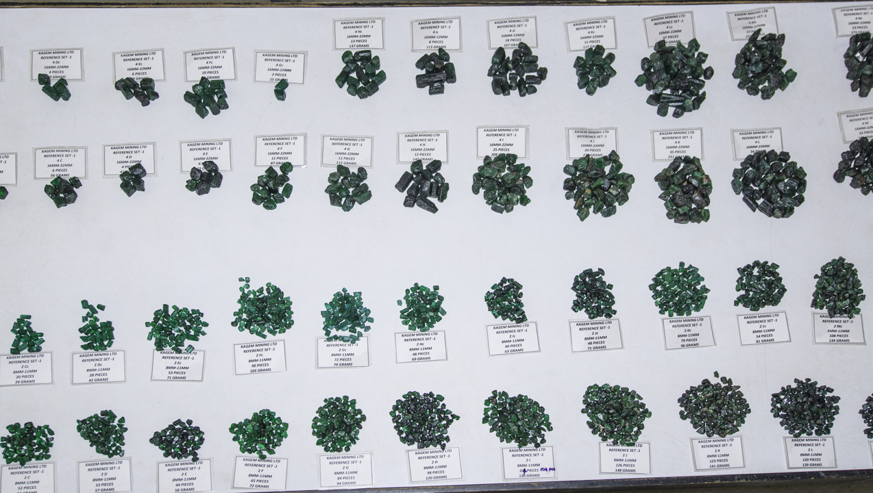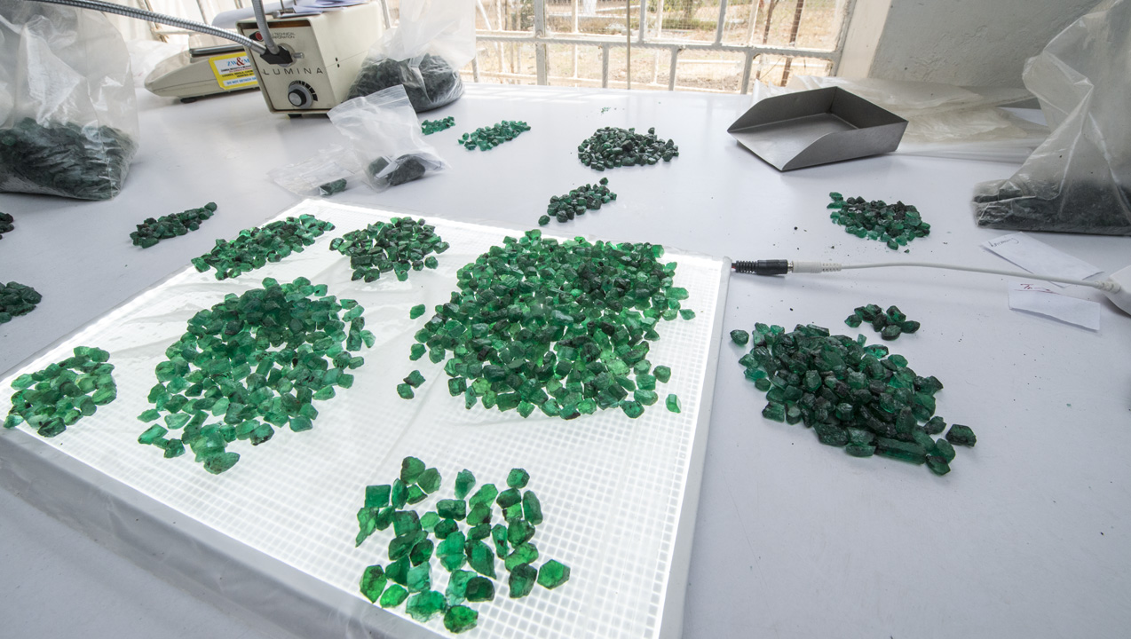 生産物は、四つの基本的な等級に分類されます:「プレミアムエメラルド」「エメラルド」「ベリル1」「ベリル2」です。その後プレミアムエメラルドとエメラルドは、サイズ分けのふるいで重量を基に分別します。 次に、色による分別が行われます。黄色の二次色を有する緑色と、青色の二次色を有する緑色です。