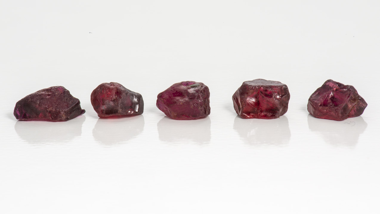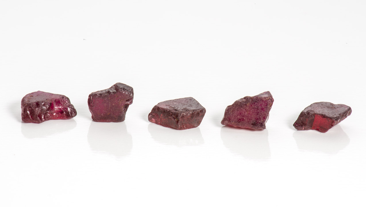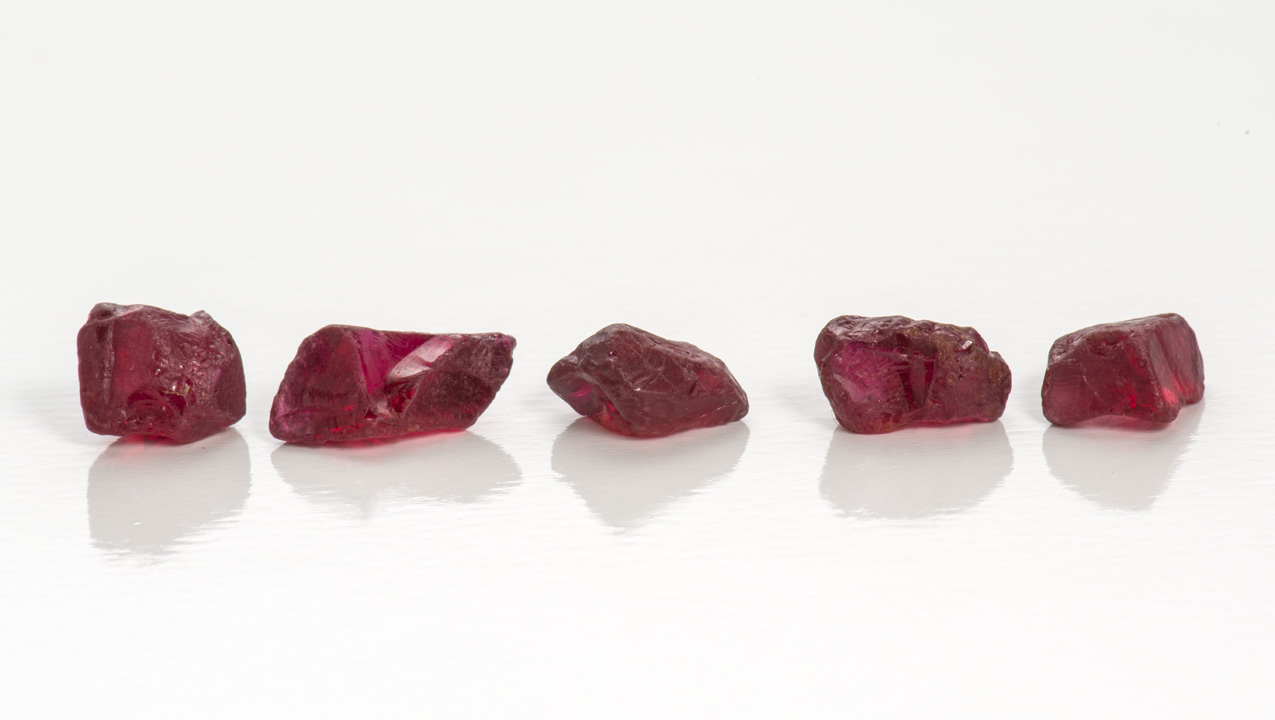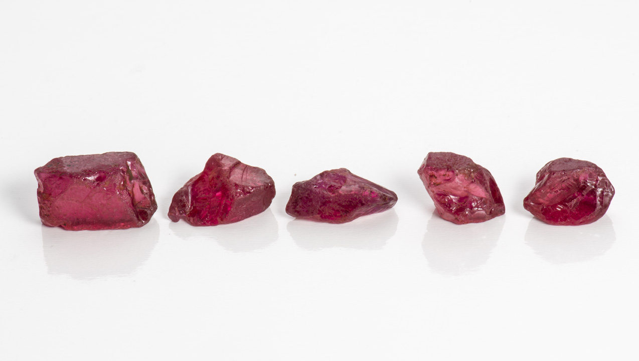 - ルビー:5グラム未満の最高品質のもの、もしくは同じ重量で色が劣るもの
