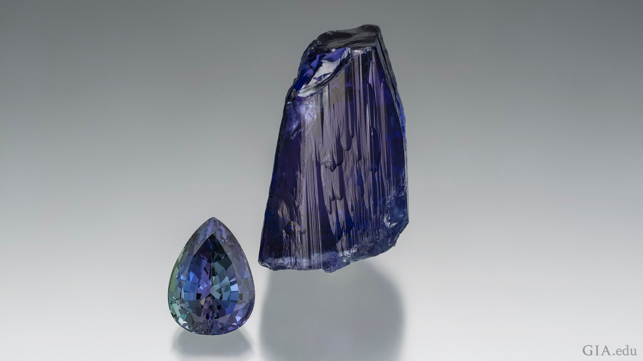 タンザナイトは、1960年代に唯一の原産地であるアフリカのキリマンジャロ山の麓で発見された近代的な宝石です。この宝石は数々の個性を持っています。タンザナイトはその多色性により、カットする方向がその石を正面から見た時の全体の色を決定することになります。タンザナイトをある角度から見ると青く見えますが、違う角度から見ると紫色に見えることがあります。または、もっとよく見てみると、運が良ければレッドグリーン、オレンジまたは茶色などの3番目の色が見えるかもしれません。カッティングはタンザナイトが見せる色に重要な影響を与えます。これと同様に、茶色がかったゾイサイトをタンザナイトとして知られている望ましいバイオレットやブルーの色に変造するために最近行われている低熱を用いた加熱処理も色に影響を及ぼします