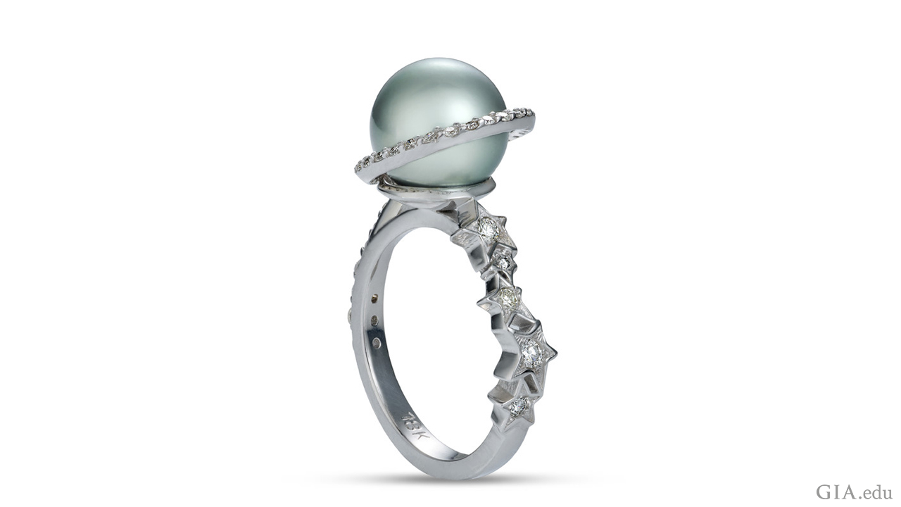 GIAのJDTプログラムの卒業生であるEckertは、Veronica Eckert Studio(Veronica Eckertスタジオ)オーナーであり、Revere Academy(リビア・アカデミー)主催2016年タヒチ産真珠ジュエリーデザインコンテストで優勝者に輝きました。 彼女が受賞したデザインは、光沢の高い12mmのタヒチ産黒真珠、ブルーサファイア、アクアマリンとダイヤモンドを特徴とする、宇宙を彷彿させる夢のような「土星への旅」プラチナ製リングです。