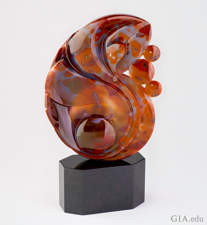 アゲートはオレンジ、茶色、黄色といった深みのある秋の色をしており、色の層や帯状になっていることがよくあります。1800年代、大量のアゲートがブラジルのRio Grande do Sul(リオ・グランデ・ド・スル)で見つかり、カッティングのためにドイツ・イダー=オーバーシュタインに送られました。ブラジル産アゲートはその色の深みのため、今日でも宝石彫刻家たちの間で人気を集め続けています。