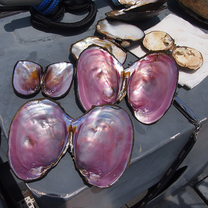 最初に試料を採取した地点では数回潜水しました。 「bankclimber(バンククライマー)」と呼ばれる種以外、研究者が関心を寄せるほぼすべての主要な種が収集されました。なので、私たちはバンククライマーを見つけるために別の場所に移動することにしました。 2番目の場所で、バンククライマーや他の淡水産貝種をついに採取しました。 pink heelsplitter(ヒラツバサカワボタン)の真珠母貝は、非常に明るい鮮やかなピンク色をしており、オリエント効果があります。 Donは、テネシー川に生息している淡水産貝の分類法と生体構造について、GIAのチームに簡単に説明してくれました。