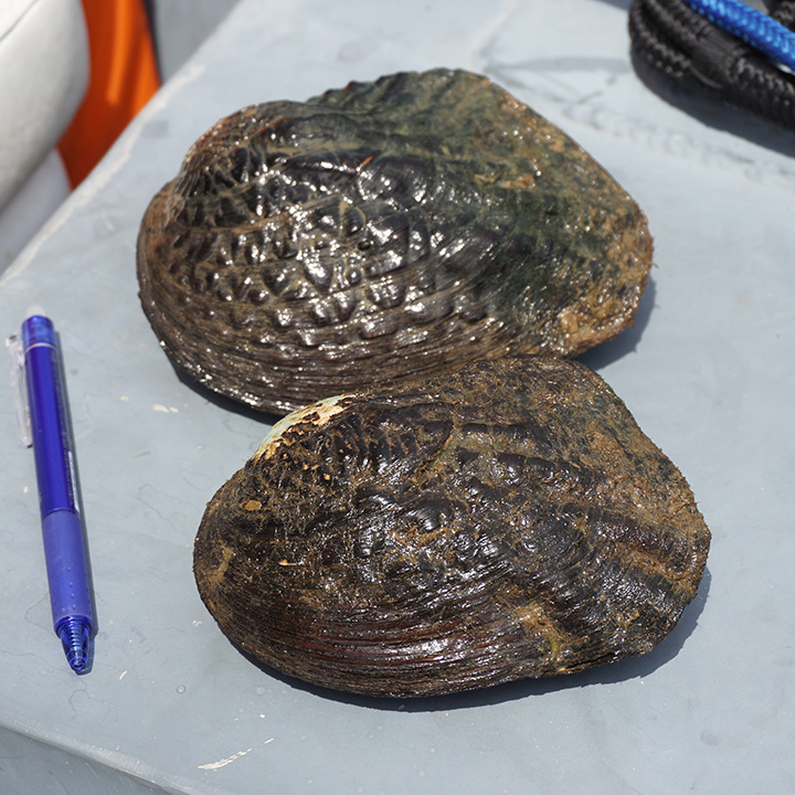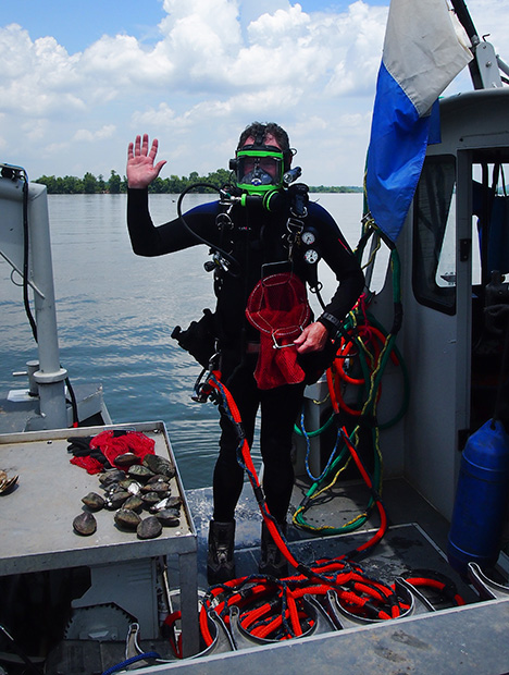 この遠征旅行の主な目的は、真珠の鑑別を支援するために、ケンタッキー湖から重要な淡水産真珠貝の貝殻を収集し、DNA分析を行うことでした。 Don Hubbsが湖の底に潜水し、淡水産貝を手で収集しました。
