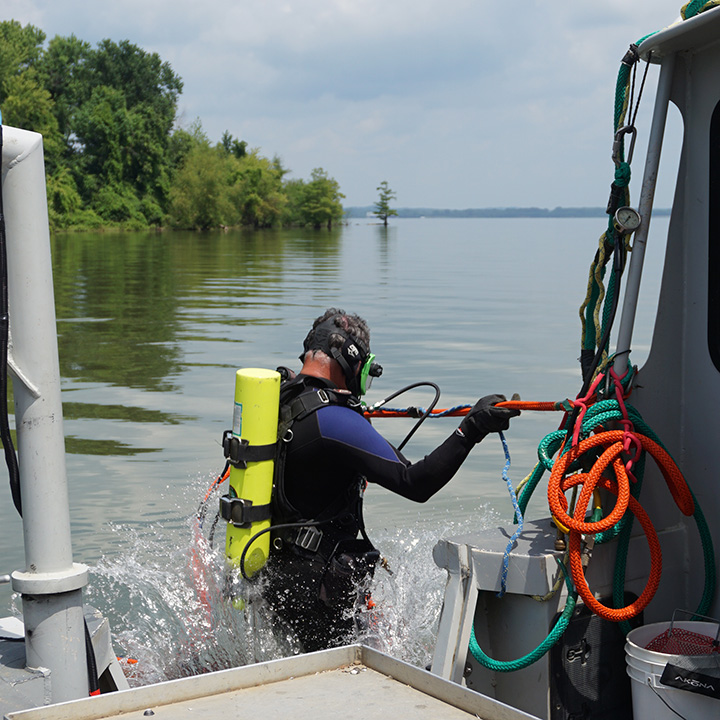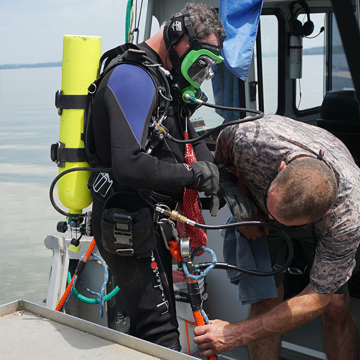 GIAのメンバーはGina Latendresseと彼女の娘と一緒にボートに乗り、DonがTWRAのボートで先導しました。 どちらのボートもニュージョンソンビルから出発し、 試料を採取する最初の地点に到達するのに約10分かかりました。 潜水は簡単な作業ではありません。 視界が悪いため予測がつかず、かなり怖いこともあります。 地元の人々の中には、川での潜水は自分たちの人生の中で最も恐ろしい経験だった、と私たちに語る人もいました。 湖底の状態に加えて、湖水の表面で人々、ボート、はしけが動いたりするので、非常に危険なことになりかねません。 安全な潜水を体験するには、一定の規則に厳密に従う必要があります。