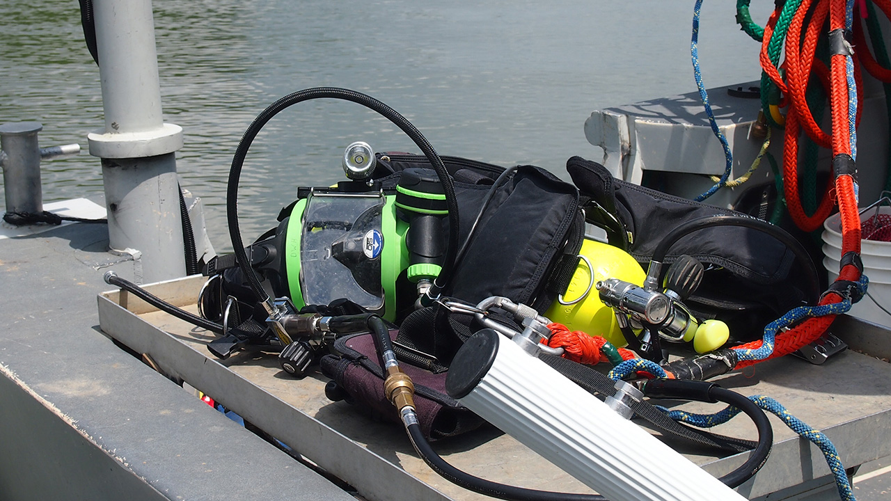 Donは、水面下にダイバーがいることを人々に警告するために、潜水する場所で2つの旗を掲揚しました。 これらはダイバーダウンフラッグと呼ばれています。国際信号旗のアルファ(A:潜水作業中、徐速通過せよ、の意)は青と白で、北米では左上隅から右下隅にかけて白いストライプがある赤い旗です。 Donは、ダイビング器材やボートのダイビング支援システムを見せてくれました。 酸素ボンベは、ダイバーが水中で45〜60分間潜るのを可能にし、2人のダイバーが同時にボートから出発することができます。 この最新型のダイビングボートにはボートで酸素ボンベを補充できる空気圧縮機があるので、ダイバーがボンベを補充するために岸に戻ることなく何時間も淡水産貝を探すことができます。 また、その機器はボートにいる者と水中に潜っているダイバーの間の通信も可能にします。