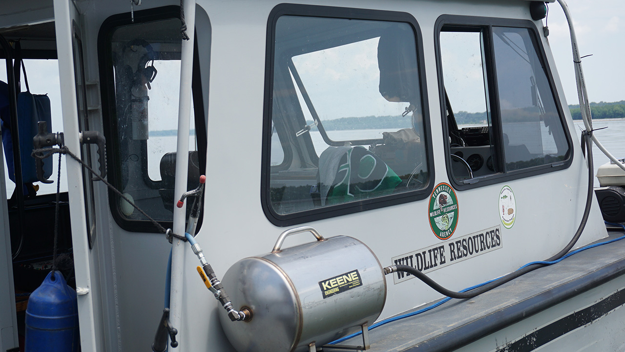 私たちのためにリバーガイド兼ダイバーを務めてくださったDon Hubbsが、淡水産貝の種とケンタッキー湖の保全について私たちに説明してくれました。 資源を枯渇から保護するために、法律で定められたサイズよりも小さい淡水産貝を採取した場合は湖に戻す必要があります。 それぞれの種により、サイズの制限が異なります。 ダイバーは、異なるサイズの金属製のリングを使用して採取した淡水産貝を測定することで、サイズを測ります。 採取した淡水産貝が大きくてリングを通過しない場合、合法に採取できます。 そうでない場合は、規制に従い湖に戻さなくてはいけません。 この規制に従わないダイバーは罰金を科されます。 また、商業目的のために淡水産貝を採取するダイバーは、ライセンスを購入する必要もあります。 Hubbsと彼の同僚はケンタッキー湖をパトロールし、淡水産貝の数の監視や絶滅危惧種の研究を行い、違法な採取が行われているかどうか確認しています。