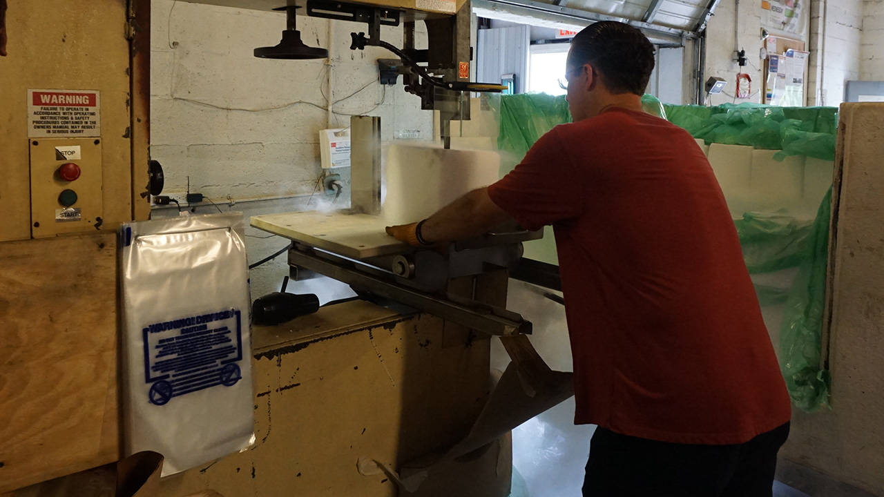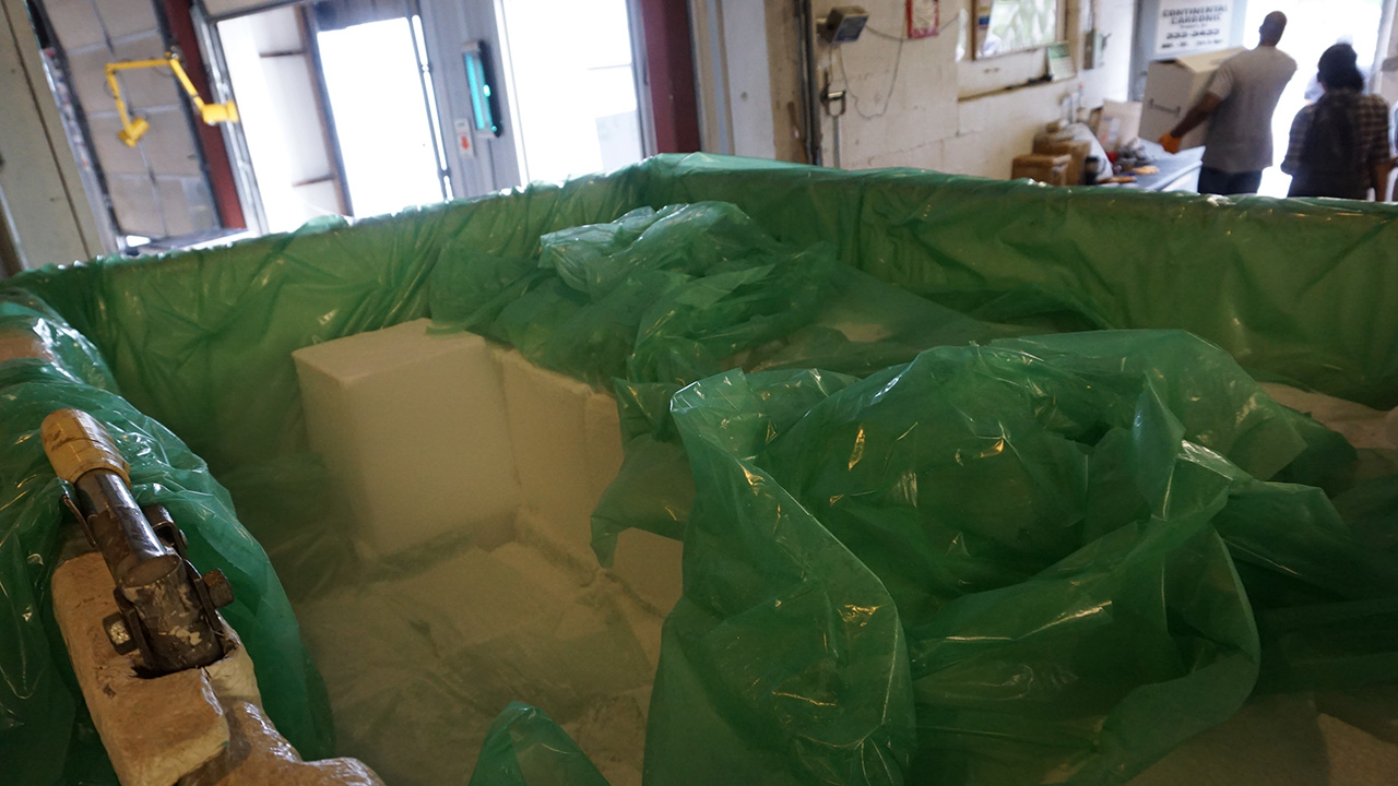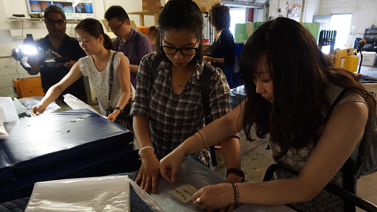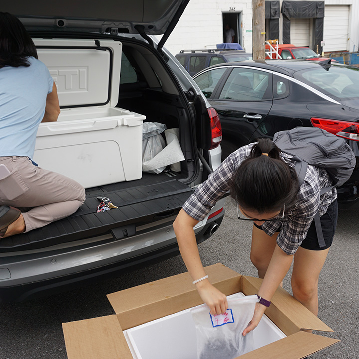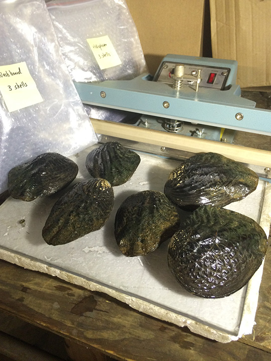 すべての試料はドライアイスと梱包して、GIAがDNAプロジェクトで共に作業している研究所に出荷されました。 梱包は、地元にあるドライアイスの会社で行いました。 ドライアイスの大きな塊は、厚めにスライスされ、紙で包装し、淡水産貝の貝殻の試料のそばに置きました。 ドライアイスの配送と輸送は非常に厳しい規制を伴い、危険でもあります。 例えば、ドライアイスを自動車で輸送する場合、換気が十分に行われるよう窓を開けておく必要があります。 ドライアイスが昇華して発生する二酸化炭素は酸素より重いので、車内の低い場所に滞留します。 このため高濃度になり易いので、自動車にいる人は警告なしに窒息してしまうことがあります。