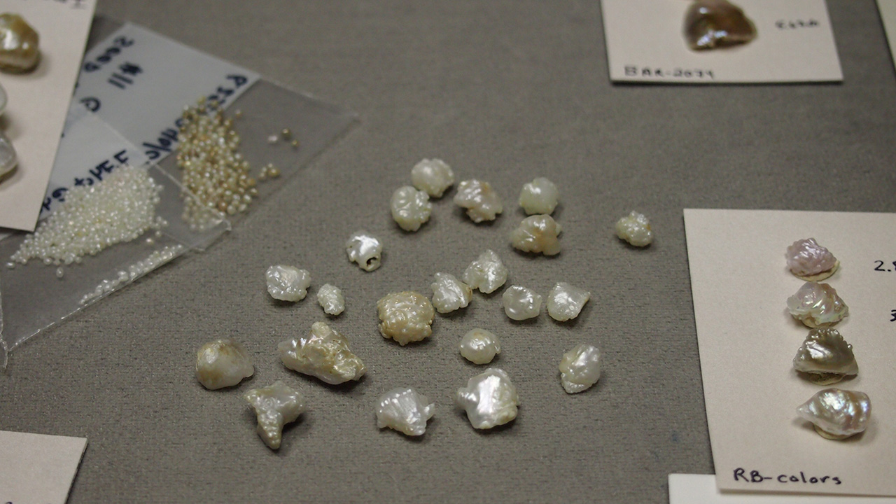 有核淡水養殖真珠が並ぶトレイ。 Latendresse家は多くの異なる形状の真珠やブリスター真珠を養殖した。