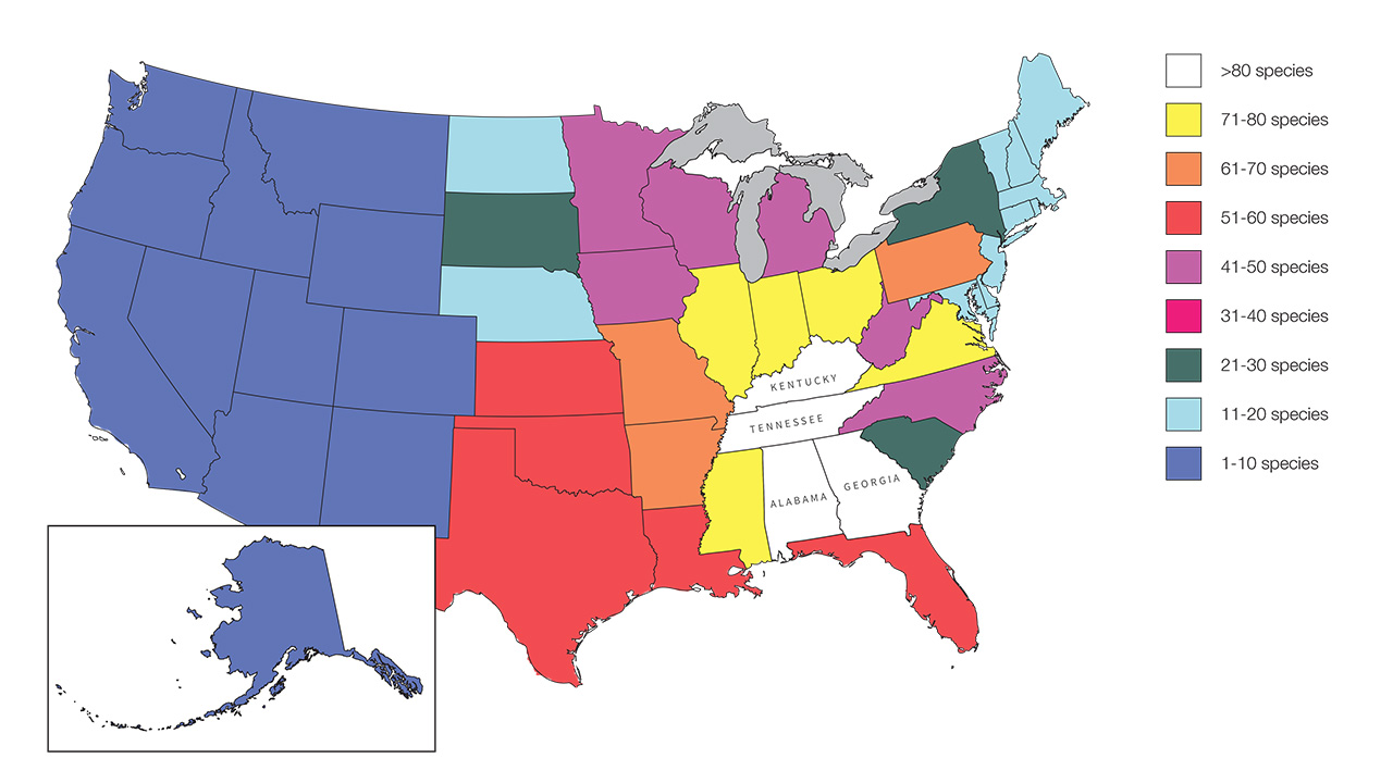 Imperiled Animals(北米で最も危険にさらされている生物、淡水産真珠貝の変化しつつある見解)』 BioScience、第54巻、5号、2004年より再現。