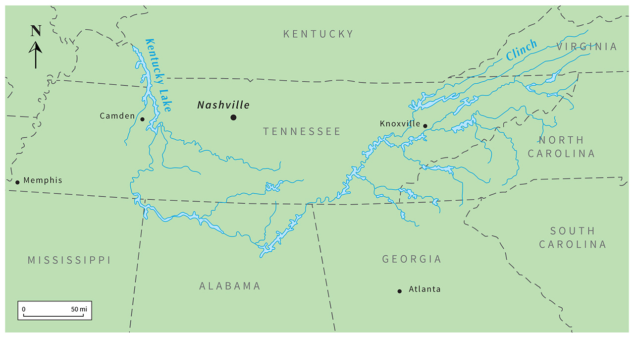 テネシー川の本流はテネシー州東部に位置するノックスビルの近くで始まります。 全長およそ652マイル(1049キロ)のテネシー川は、オハイオ川最大の支流です。 テネシー川はノックスビルからアラバマ州北部へと横断しながら南西部に流れ出し、同州を経て西に渡り、ミシシッピ州との国境の一部を形成して、テネシー州へと再び戻ってきます。 テネシー州では、この川がテネシー州を中部と西部に分割します。 グループはナッシュビルから西部へと運転し、テネシー川のこの部分を横断しました。 真珠の町、カムデンはこの川のすぐ西にあります。