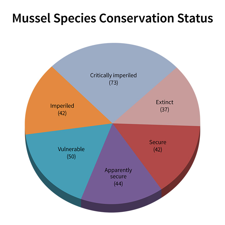 北米ではおよそ300種の淡水産母貝の多くが危険にさらされている。 この円グラフは