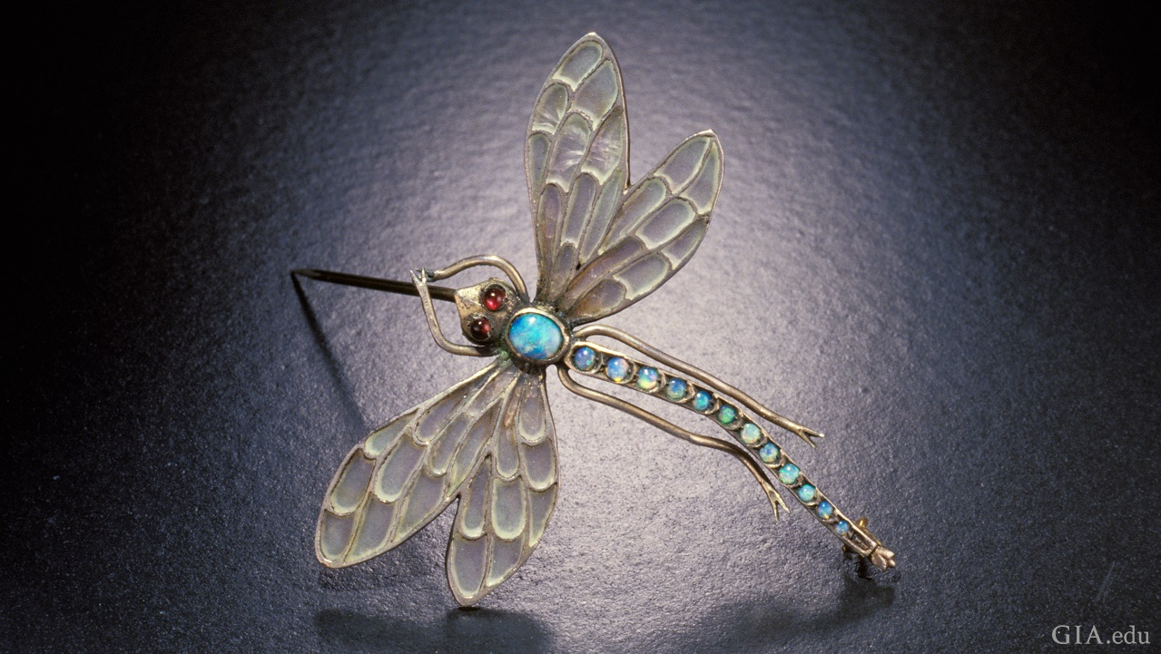 ビクトリア朝およびアールヌーボーの宝飾品の両方で人気が高いエナメル加工は、多くの場合、宝石を使うだけでは表すことができなかった花、葉、昆虫の動きおよび繊細な色とデザインの両方を表現するのに最適の技法でした。プリカジュール(Plique-à-jour)は、光がエナメルを介して通過するように構築されたエナメル加工であり、エナメルが半透明に見え、トンボや蝶などの羽のある昆虫を表現するのに適しています。また、アールヌーボーの宝飾品を制作していたジュエラーは、遊色効果があることからオパールを非常に好んでいました。