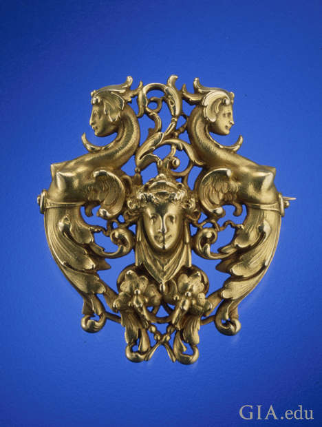 ルネッサンス・リバイバルのジュエリーは、グロテスクなスタイルを再びデザインに取り入れるようになりました。グロテスクとは、イタリア語のグロッテスキ(grotteschi)という言葉に由来しており、1500年頃にローマで発掘された洞窟(グロッタ)の装飾、特に65~68年に建てられたローマ皇帝ネロの黄金宮殿のことを指します。「グロテスク」という言葉は、動物、人間、植物を共に使用した奇妙な文様のことを指し、美しいとは思わないという方も中にはいます。