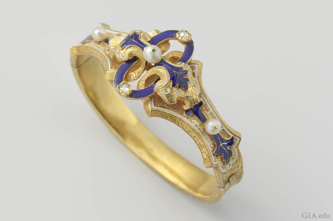19世紀のジュエリーは、良い状態で保存されたルネッサンスの作品やジュエリーデザインの書籍に保存されたものなど、様々な要素からインスピレーションを受けました。中央にカラーストーンや真珠があしらわれており、その周りに小さな宝石が散りばめられているジュエリーが、ルネッサンス・リバイバルを象徴するペンダント、ブローチ、イヤリングの特徴でした。様々なエナメル処理の技術が、カラフルなアクセントとしてよく使われました。