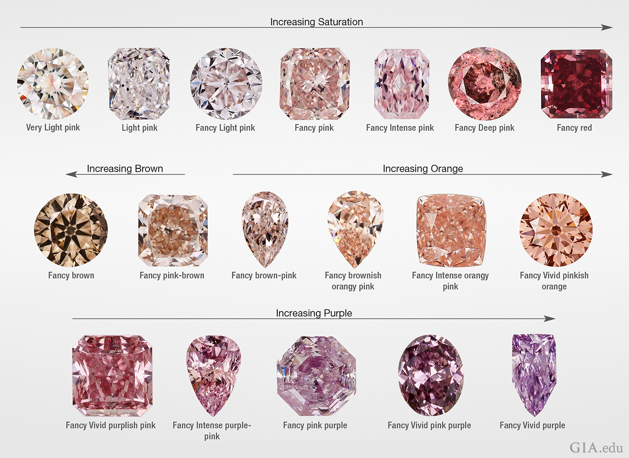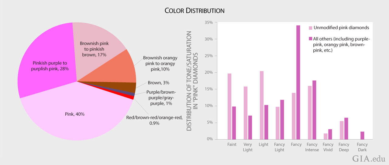 この研究に使用されたダイヤモンドは、47%がアンモディファイドピンク(他の色が観察されない)、28%が紫がかったピンクからピンクがかた紫色、17%が茶色がかったピンクからピンクがかった茶色、10%が茶色がかったオレンジピンクからオレンジがかったピンク、3%が茶色、1%がパープルブラウン、パープルグレー、パープル、0.9%が赤、ブラウンレッド、オレンジレッドでした。アンモディファイドピンクダイヤモンドのうち、54%がフェイントからライトのピンクとグレーディングされました。