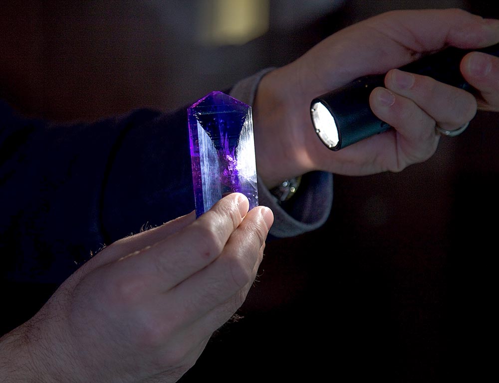 タンザナイトを傾けると、3つの結晶方向に3つのはっきりと異なる色が見られます。