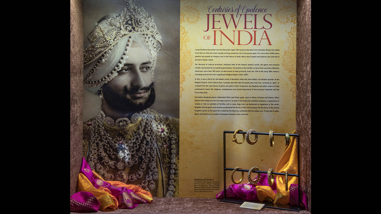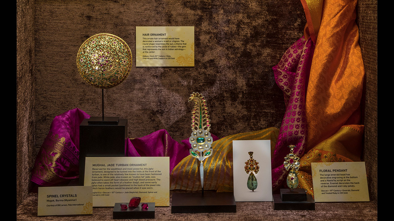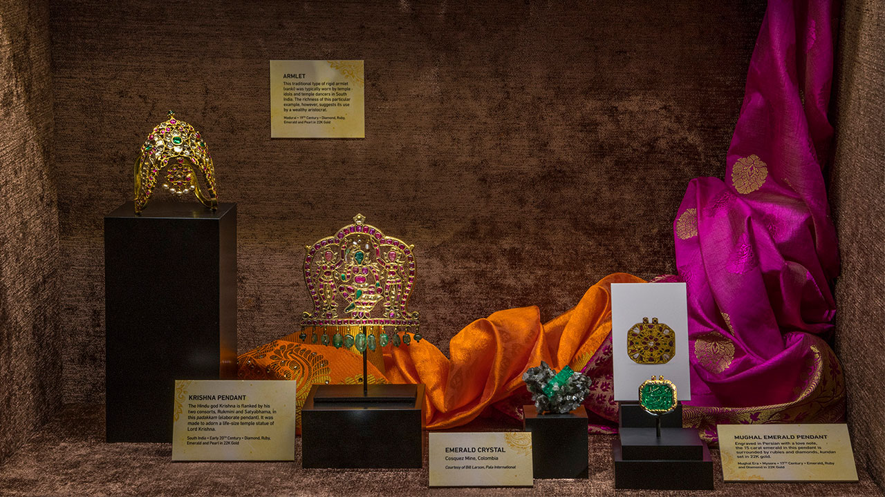 This exhibit features 50 exquisite gemstone jewelry pieces and objects from India on loan from a private collection. Never seen in public, these pieces - including several from the magnificent Mughal Empire (1526–1857) - showcase more than 300 years of adornment from the 17th to the 20th centuries. The exhibit explores the distant sources of the diamonds, rubies, emeralds, sapphires and other gems decorating these pieces, their religious and cultural symbolism, the wars fought for them and the historical tradition of gemology in India.