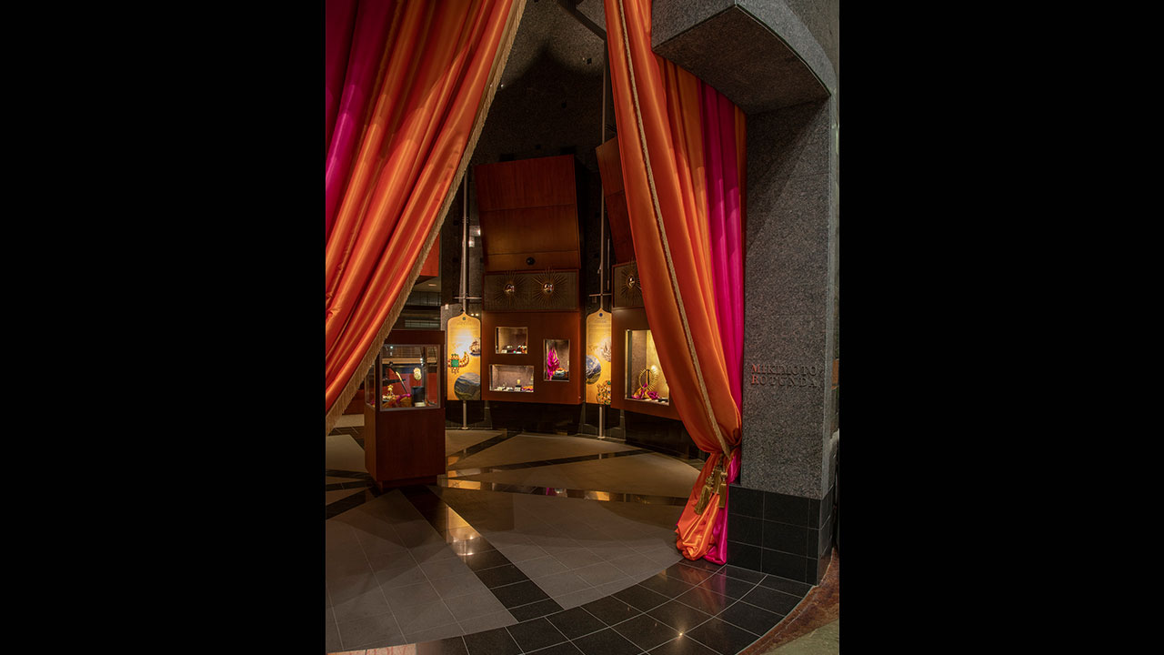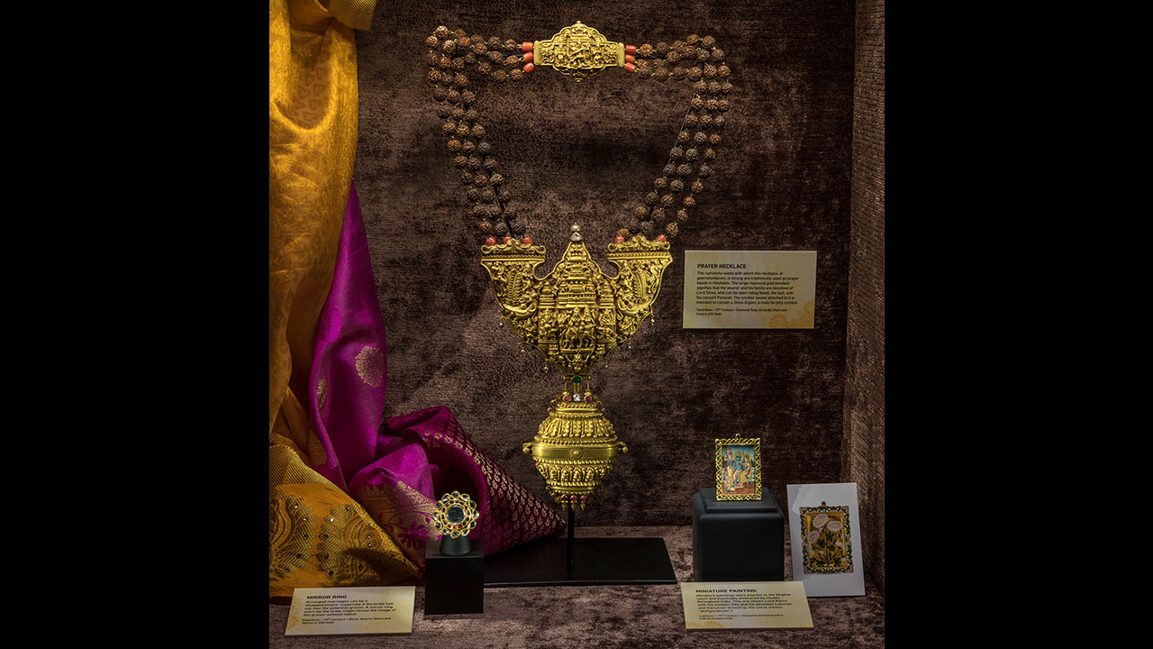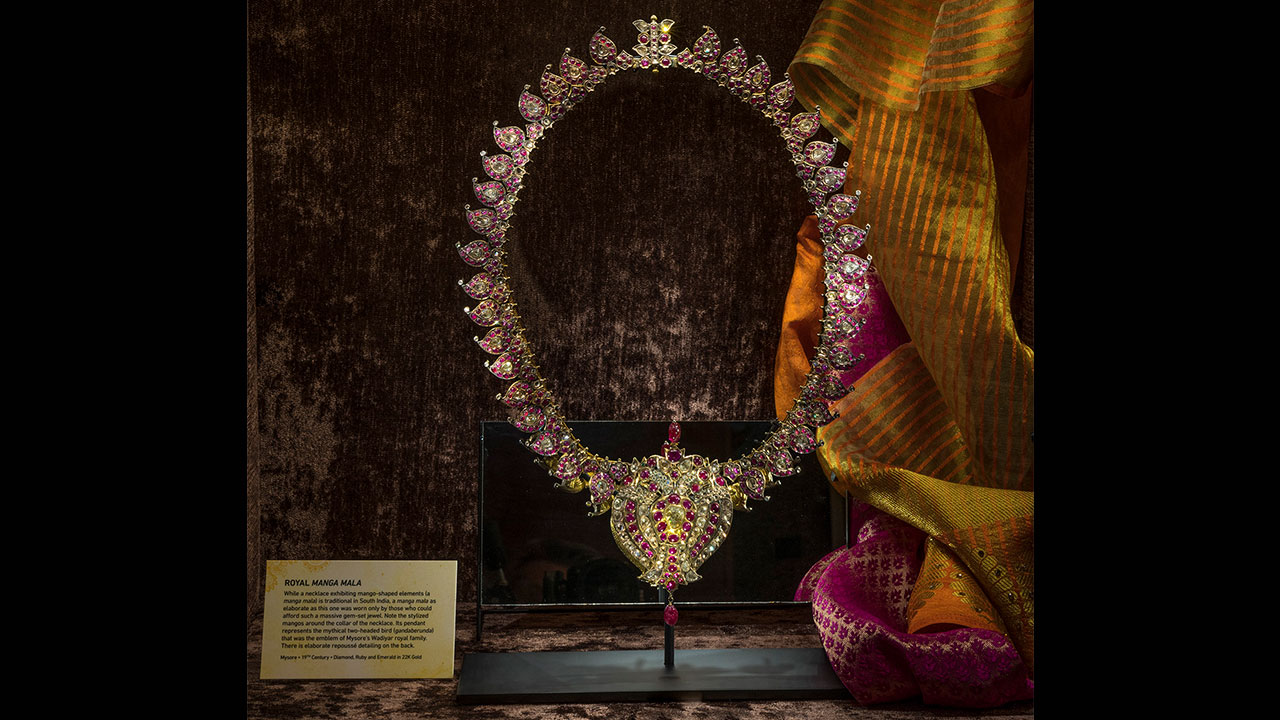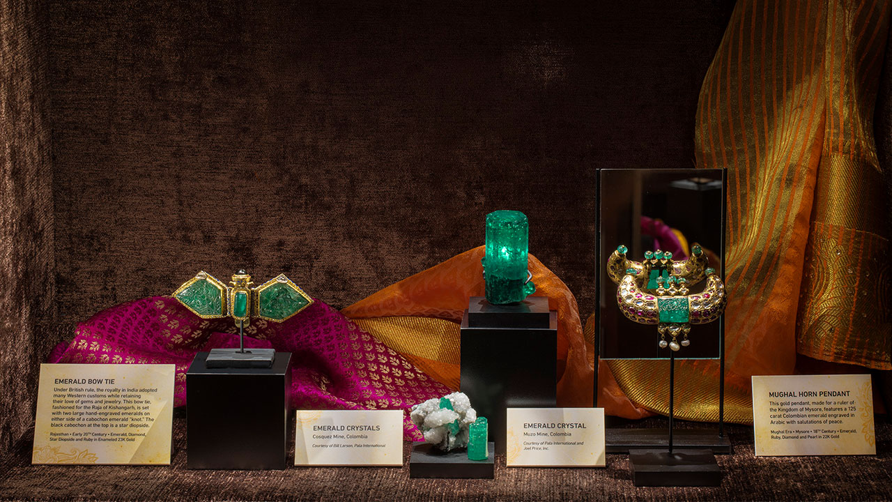 This exhibit features 50 exquisite gemstone jewelry pieces and objects from India on loan from a private collection. Never seen in public, these pieces - including several from the magnificent Mughal Empire (1526–1857) - showcase more than 300 years of adornment from the 17th to the 20th centuries. The exhibit explores the distant sources of the diamonds, rubies, emeralds, sapphires and other gems decorating these pieces, their religious and cultural symbolism, the wars fought for them and the historical tradition of gemology in India.