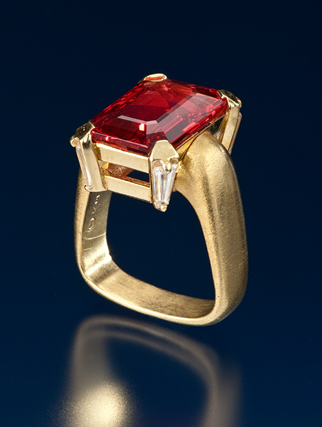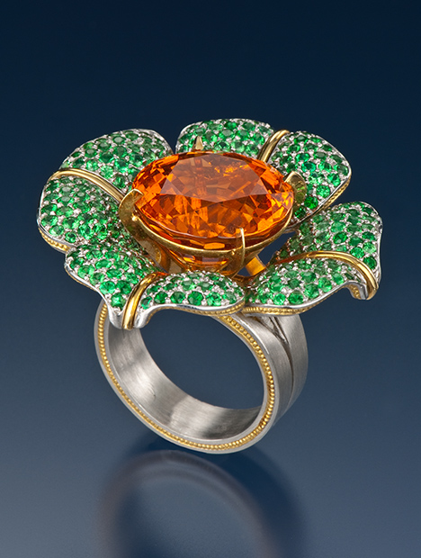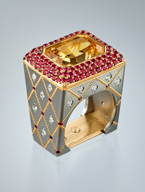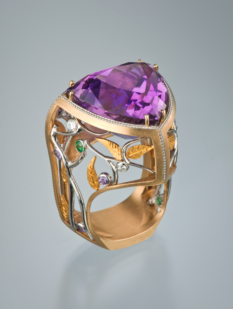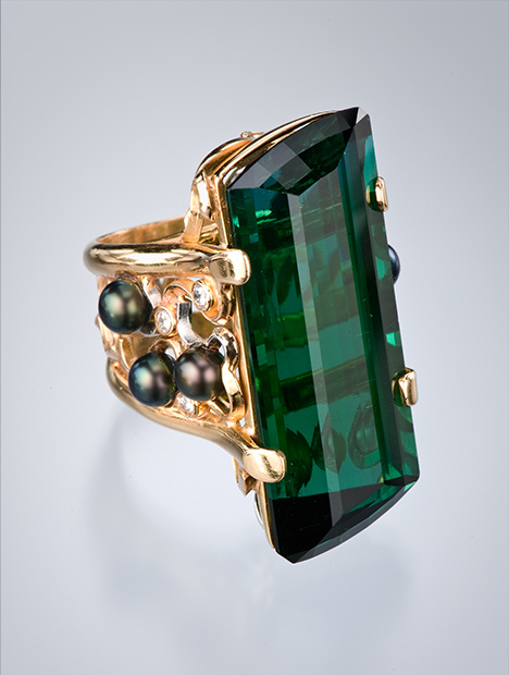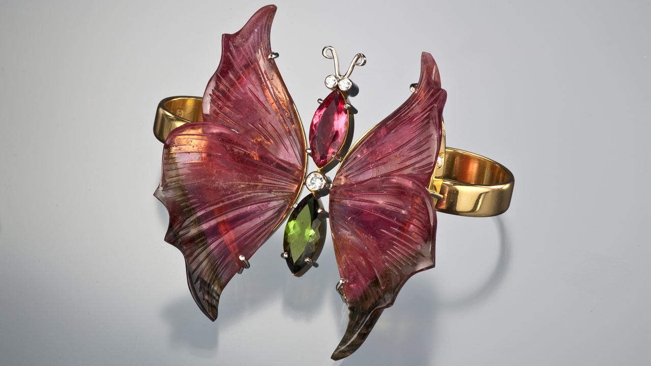 Zoltan David is an award-winning artist, and his fourteen one-of-a-kind jewelry pieces in the GIA collection are breathtaking expressions of his inspirations and design philosophies. Some of his work reflects the subtle beauty of the natural world, while others are free-form avant-garde creations. Brightly colored gemstones are the unifying theme in the eclectic collection, revealing the artist's love of contrast and color. Each creation is truly a statement piece. The collection comes to GIA courtesy of the late Nancy Feinstein. David is a designer from Austin, TX.