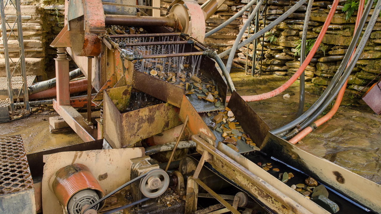 Trucks then haul the diamond-bearing gravel to a processing (or washing) plant, where diamonds are separated from the gravels and other minerals, often referred to as overburden. The processing plant uses a feeder to bring the gravel into an automated system. There it is washed with a water cannon before separation. A vibrating screen then removes coarse material, and sluices transport the remaining gravel to a worker who washes it by hand while a sorter sifts through the material looking for the occasional diamond.