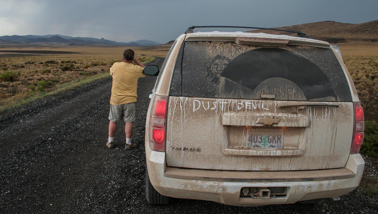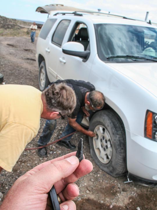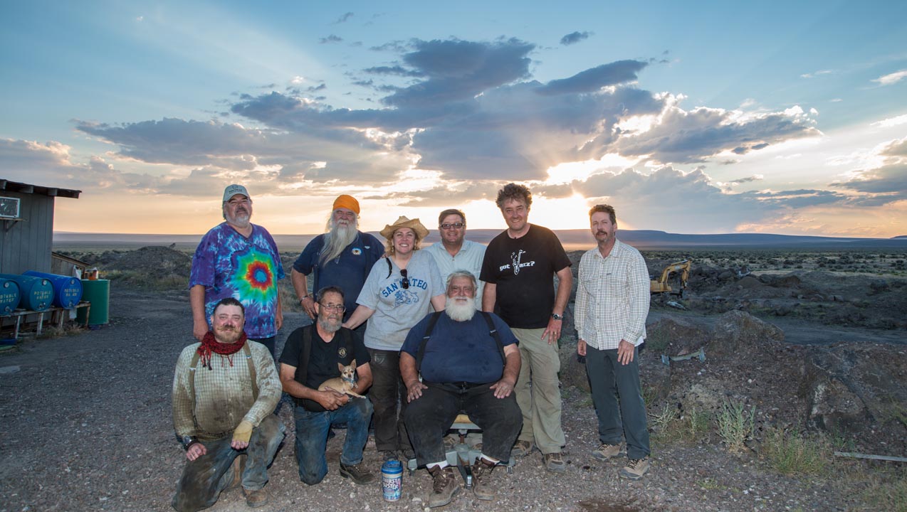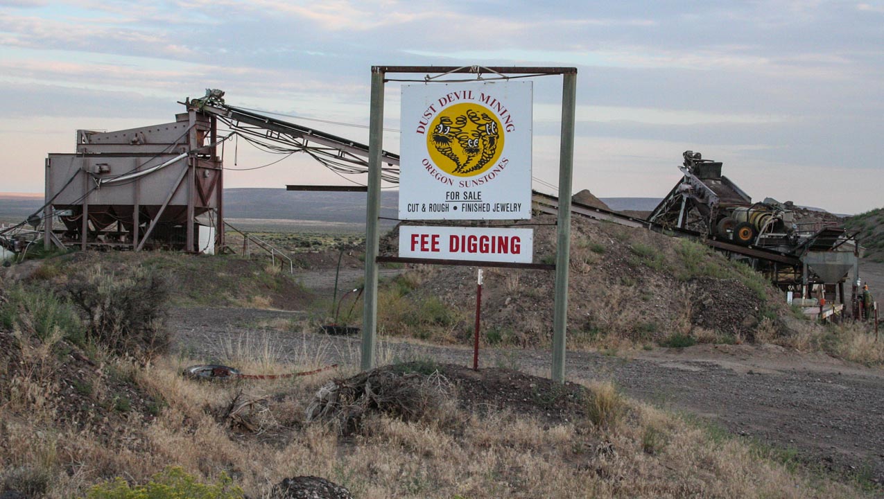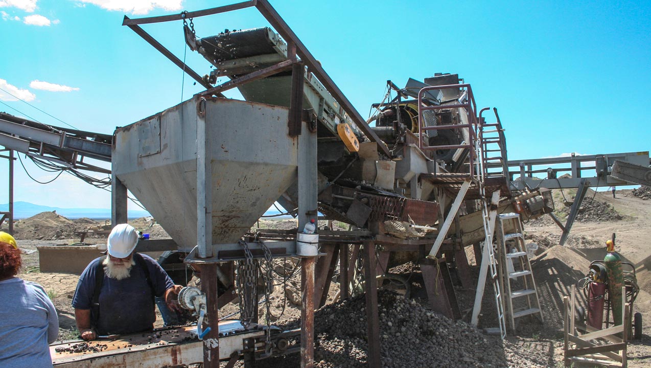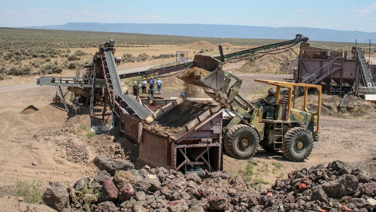 For the last couple of days we’ve been surrounded by the Ponderosa mine’s towering pines. Today, we’re a hundred miles farther south—and a thousand feet lower—on the road to the Plush sunstone mining area. Our next stop is Don Buford and Terry Clarke’s Dust Devil Mine in the heart of the Rabbit Basin. This is expansive country: forbidding volcanic hills form steep ridges that loom above flat, open valleys dotted with sagebrush. The high desert has its own unique beauty.Don’s email also told us that any car with decent tires would do, and after thirty bumpy miles, we arrive at the mine. As Don assured us: “You can’t miss us, lots of trailers and shakers and conveyors.”