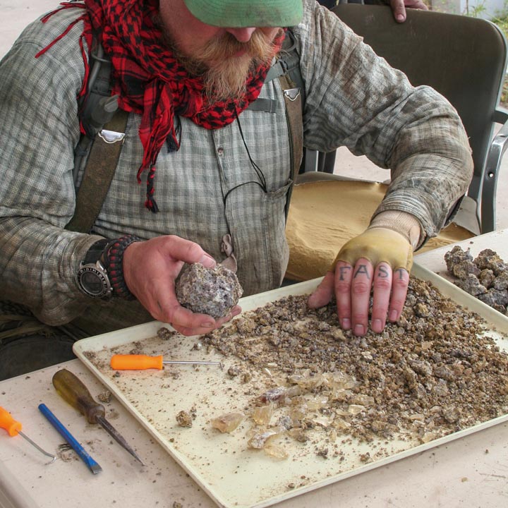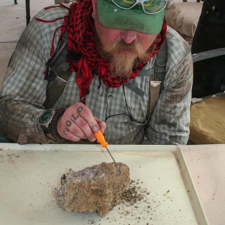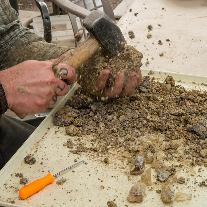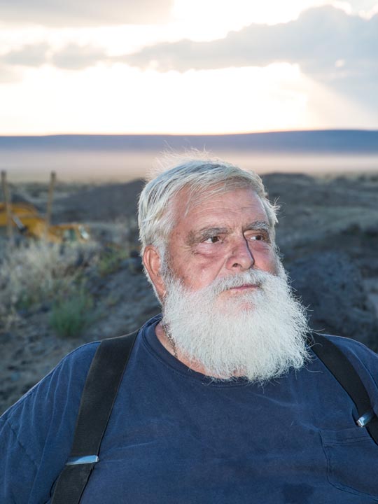 After a lifetime of working the desert for sunstone, Don turns his miner’s eye to the landscape for clues. The first things he looks for on the surface are stones with sharp edges, which indicate they’ve been recently deposited and there’s probably more underground. He tells us that worn stones with sand-blasted edges might have come from some distance away, or might even have been on the surface for 100,000 years.Next, he seeks out the tallest sagebrush because it can indicate easier mining conditions. Much of the rock covering the sunstone-bearing basalt is heavy, requiring drilling and blasting, but tall sagebrush—above five or six feet—is a good indication that the plant’s roots are able to reach water, and that means, as Don explains, “the rock is fractured…we can get through it.”