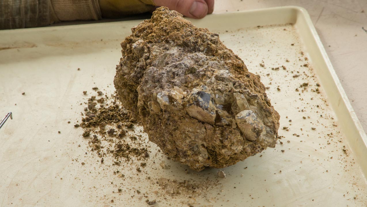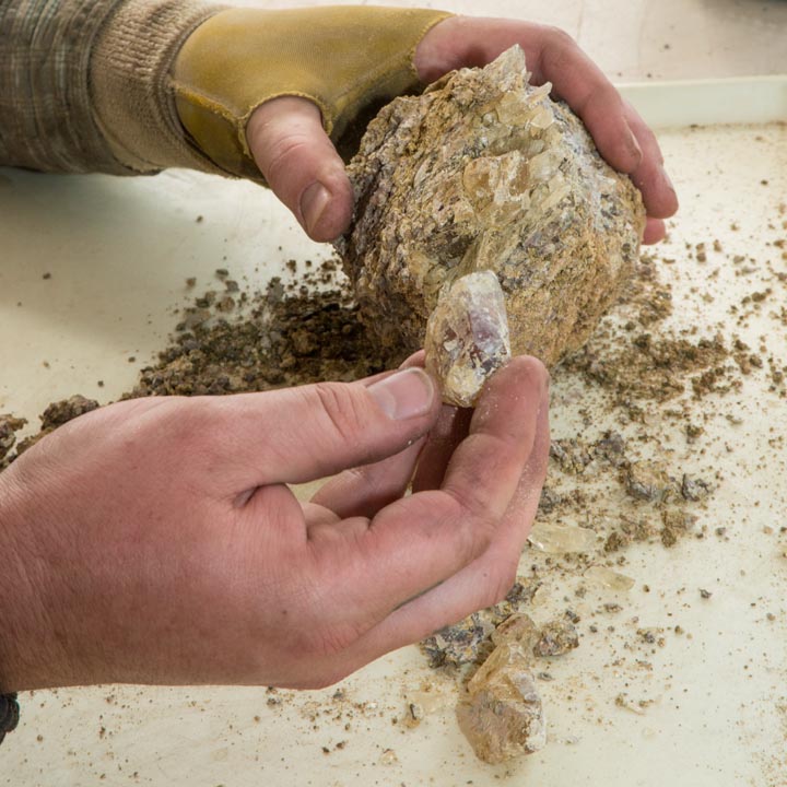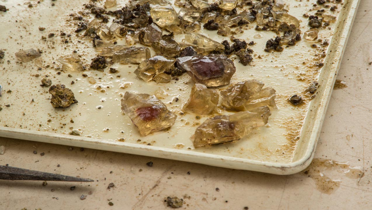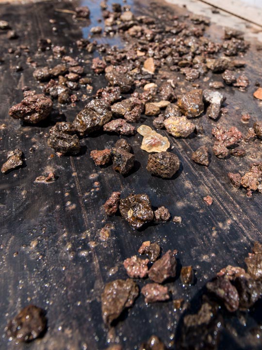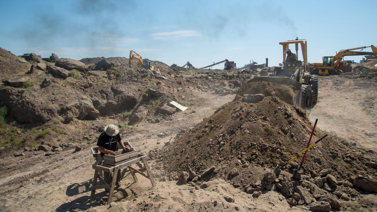 Don explains that the mine’s location is very favorable. “We’re on the edge of what was a great inland sea, and a river flowed right past our camp, so we have a lot of decomposition of the basalt that holds the sunstone.” This makes the rocks that contain the gems softer and easier to mine.