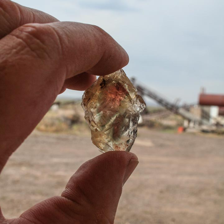 After just a few days in the high desert, I think we are becoming attuned to its beauty: the clarity of the air, the lure of a red glint of hidden sun in the rock. There’s a lightning storm on our last evening that shocks the sky with blasts of sudden light. We all stay up to watch the hills light up like daytime.The next morning we leave to visit the last mine on our trip, a distinctly different one where the miners dig into the flank of a small volcanic hill—Sunstone Butte. As we drive off, some of Don’s words ring in my ears: “These stones are mined by hardworking Americans…there’s nothing like it in the world…and Americans should want to buy our stones.”