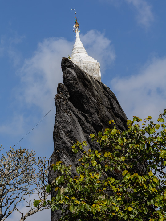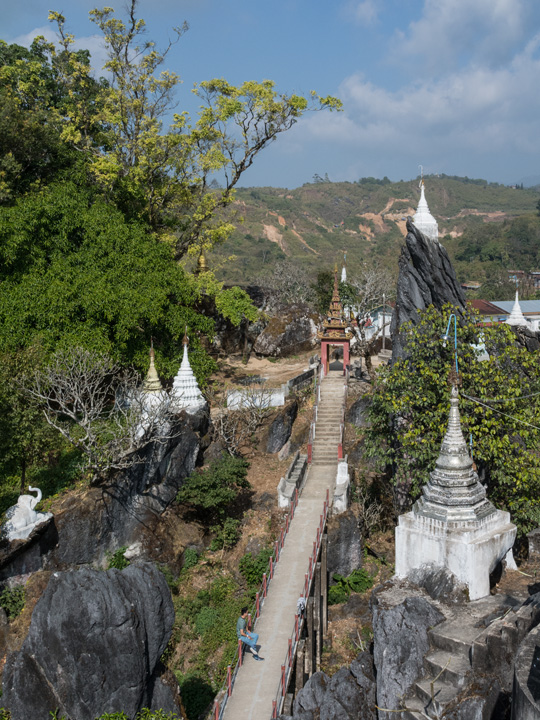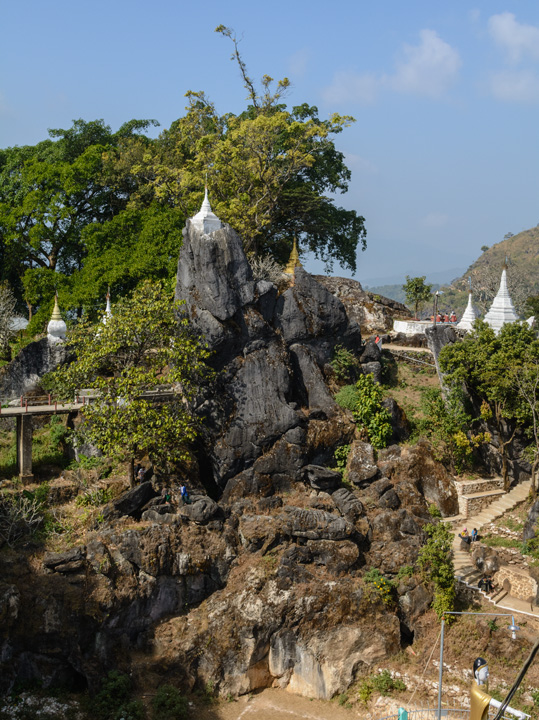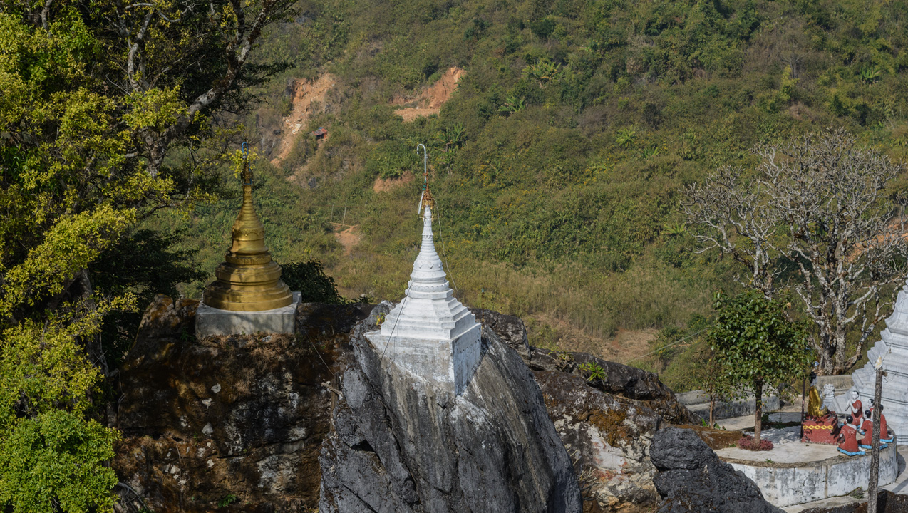 To view the topography of the Mogok Stone Tract is to witness a true geological spectacle. It is one of the most interesting and diverse gemstone environments in the world, with a wide range of geological events happening in the area.Among the most striking visuals of the geological environment are the impressive marble pinnacles that are blackened from weathering. These formations are visible throughout the stone tract and can vary tremendously in size. Once the black, weathered surface is removed, the white marble becomes visible. One of the largest of these outcroppings is the one that the temple Kyauk Pyat That sits upon. It is truly amazing to see these temple structures sitting on outcrops of rock called karsts, like something out of the science fiction movie Avatar.