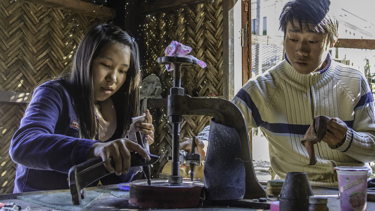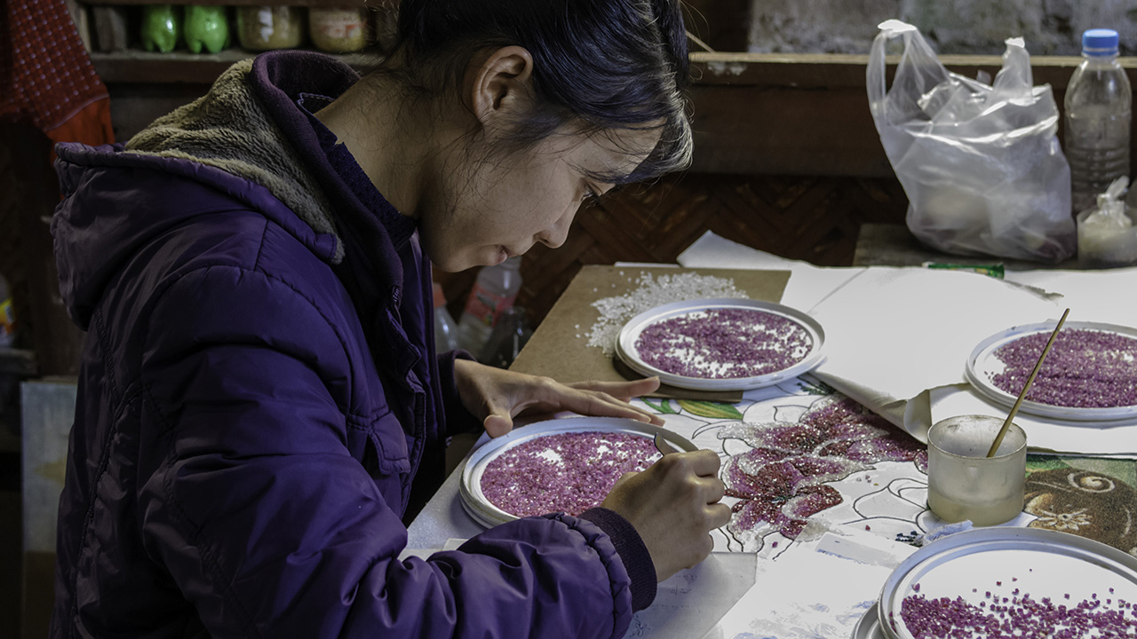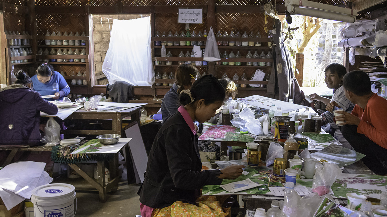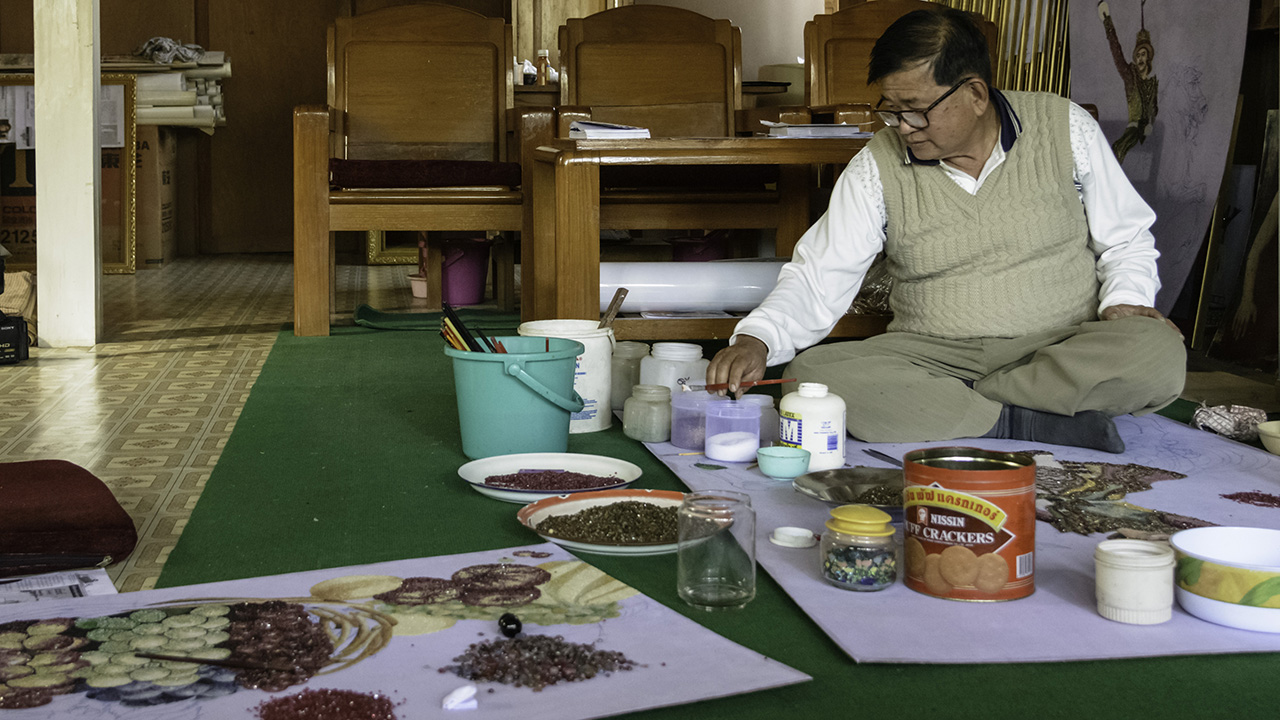 The cutters were fashioning ruby, intensely colored spinel, sapphire, peridot, and other native Mogok Stone Tract gems. While many of the cut stones in the market had what are called native cuts with less than ideal proportions, some were cut very well and the stones that were fashioned at this tiny home-based factory were well cut and beautiful.Other components of the local gemstone value chain were gem paintings. The authors had both previously seen this industry in the Luc Yen area of Vietnam. In Mogok, we witnessed a master artist, a gem-painting factory, and some stores selling gem paintings. This art form incorporates tiny gems not suited for jewelry use and turns them into artistic creations. Being able to utilize all the material from a mine in some profitable fashion increases the likelihood of continued mining. Hopefully, this art form will grow and spread throughout gem-mining communities.