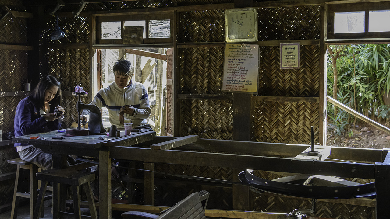Most of our expedition was spent at gem mines and gem markets, as that was the focus of our trip. However, it is always interesting at any location, and especially at a source, to witness the area’s complete value chain. The first thing we noticed in the markets was that finished stones were offered for sale along with the rough. It is not uncommon for stones to be fashioned at cutting centers far from a gem source and be brought back to that source for sale. However, many of the stones seemed to be cut in the Mogok area.We visited a small but active cottage-industry cutting center. The word "cottage" is meant literally, as the cutting was done in people’s homes, which is very common in Mogok. The cutting machines were amazing as they were not powered by electricity but by foot power. The cutters pedaled back and forth to power the lapidary wheel and polish the stones. It was truly eco-friendly gem cutting.
