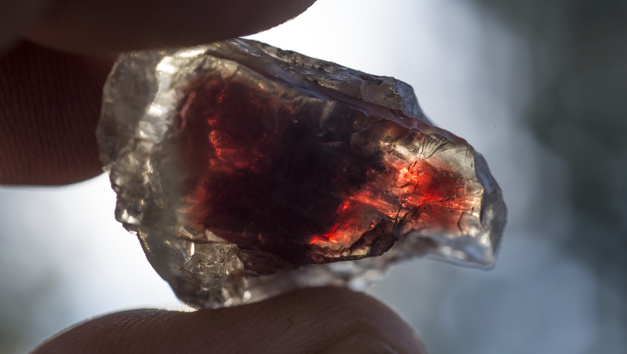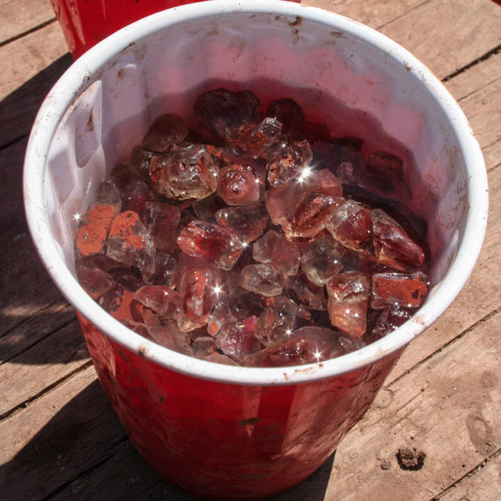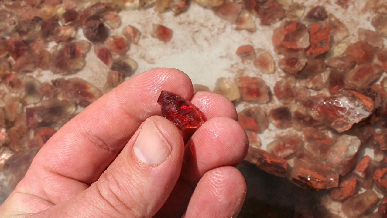 He plucks out a limpid chunk of feldspar. “There’s a beautiful yellow…it’s a nice big size…see how clear and nice that stone is…that’ll make a terrific stone.” And then, a better prize: “Here’s a beautiful red…that’s going to make a tremendous faceted stone!”