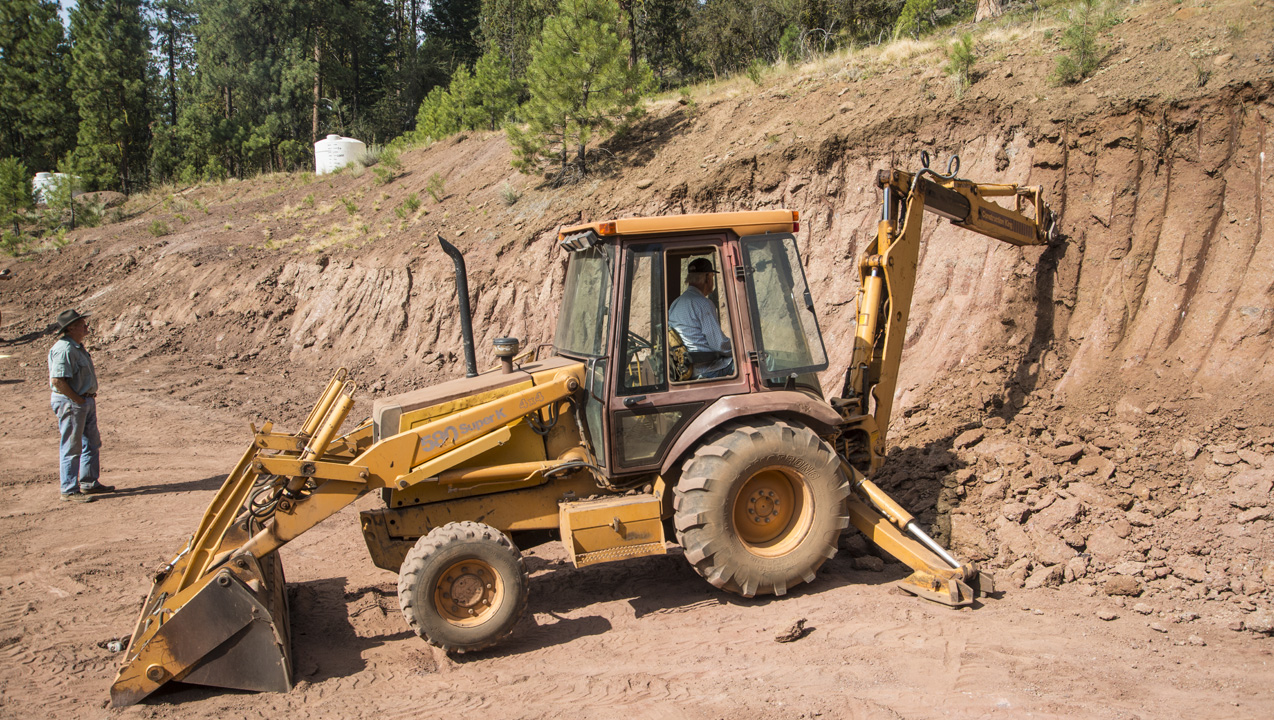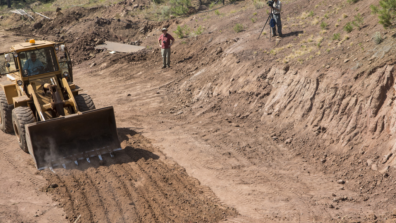 Once enough of the pit wall is torn down by the backhoe, a small loader moves the ore onto an area of the pit floor. Next, the Ponderosa crew runs their massive forty-thousand pound loader over the material to crush it and loosen the stones.
