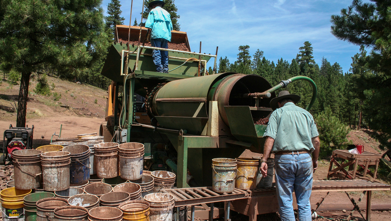 The loader feeds the crushed rock through a dry trommel—a rotating screen that, with the harsh clatter of stone on metal, separates the dirt from the ore-bearing material. The next stage is a second trommel, this time using water. John tells us this piece of equipment takes the concentrate and “washes it, scrubs it, and knocks off a little bit of the volcanic crust that’s on the crystals.”
