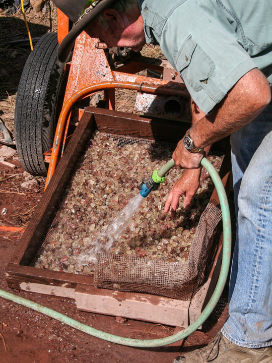 When John tips out the mixer, there’s a crystalline glitter and tinkle as freshly washed rough cascades onto a small screen. “I’m looking for how many reds and how much schiller is in there…I’m looking for good stones that will bring money.”