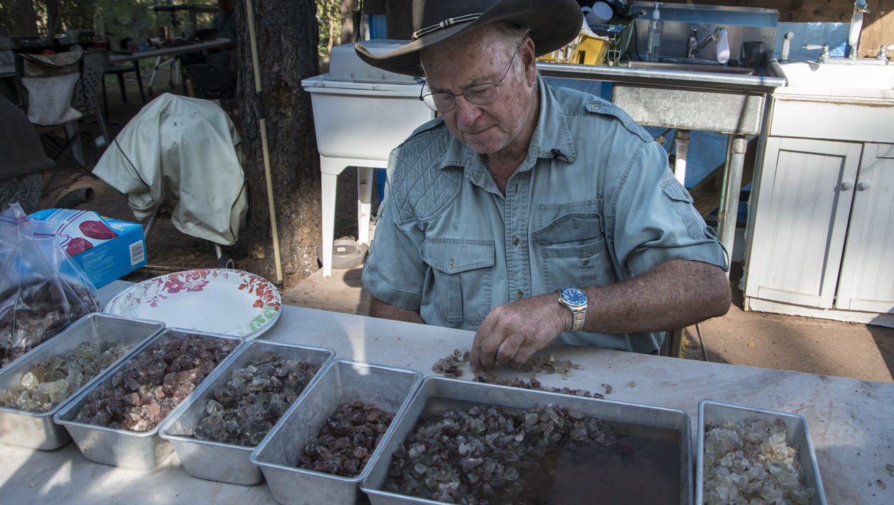 The final step at the mine is to grade all this freshly cleaned concentrate. John leads us to a small table in front of the mine’s bunkhouse, where trays of sorted rough—reds, bicolors, schiller stones, yellows, and clears—rest in water-filled metal trays. The water cuts down reflections and helps with grading, he explains. There, in the shadow of tall ponderosa pines, John outlines the qualities a really fine gem might have: “The pinnacle is if it would be good enough to make a carving. A carving has to be something over 25 carats finished.”